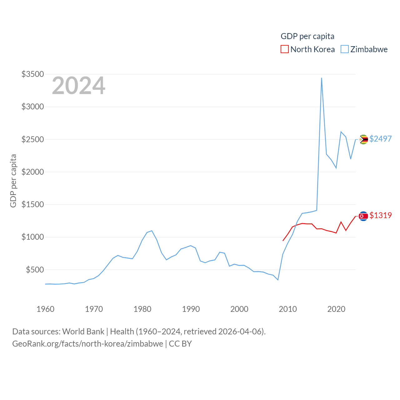 By GDP, North Korea ranks 106/197 ($34.9B) and Zimbabwe ranks 102/197 ($41.5B). By GDP per capita, North Korea ranks 168/197 ($1,319), while Zimbabwe ranks 148/197 ($2,497).
