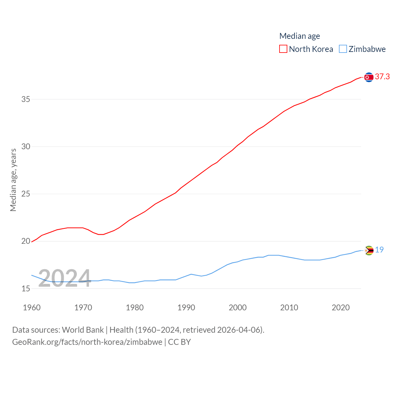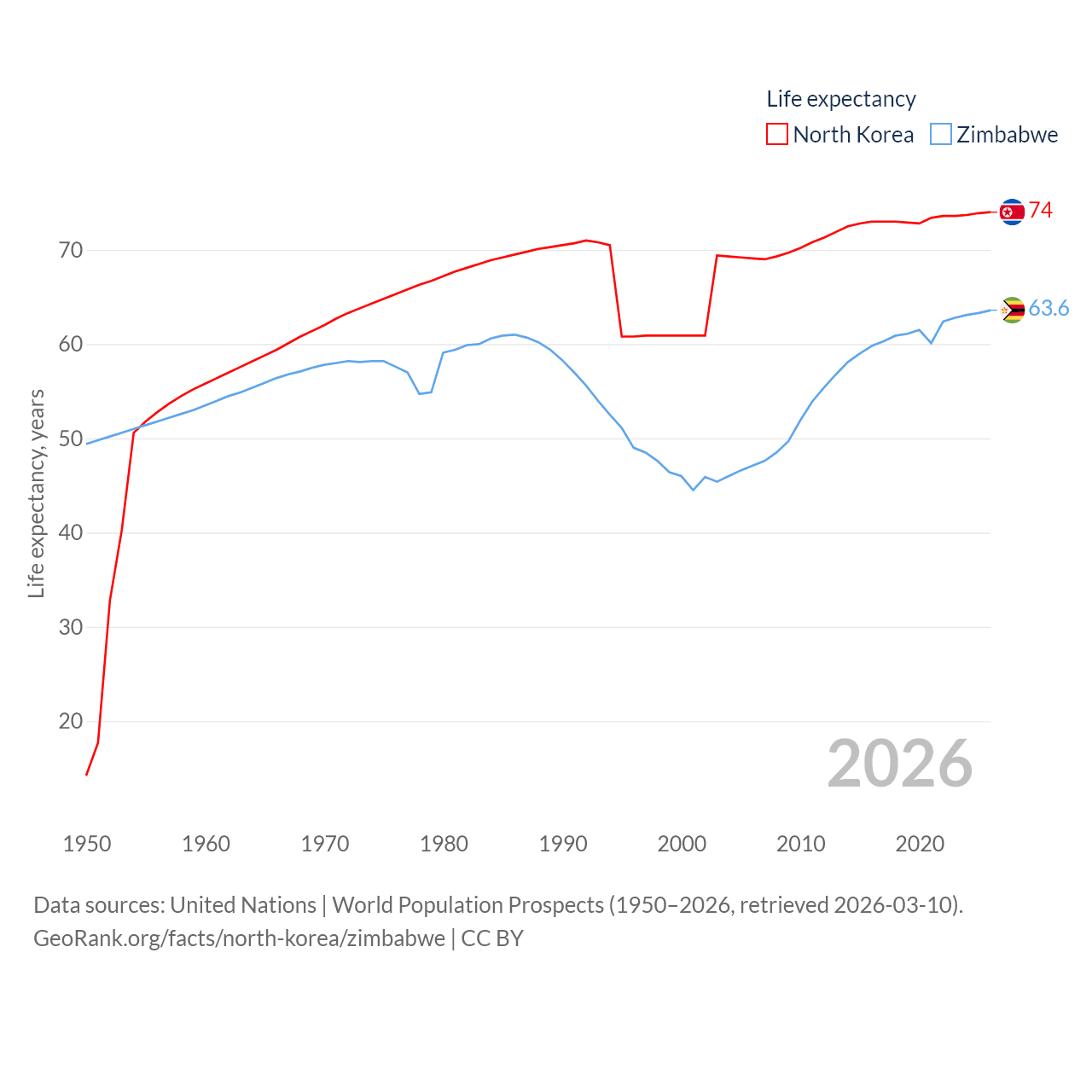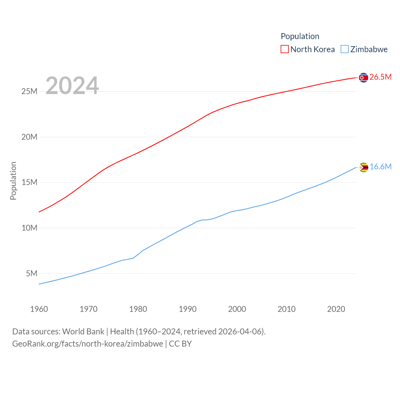 North Korea has a population of 26.5M (ranked 56/197), compared with 16.6M in Zimbabwe (ranked 74/197). North Korea's land area is 46,491 sq mi versus 149,364 sq mi for Zimbabwe (ranked 97th vs. 60th).
