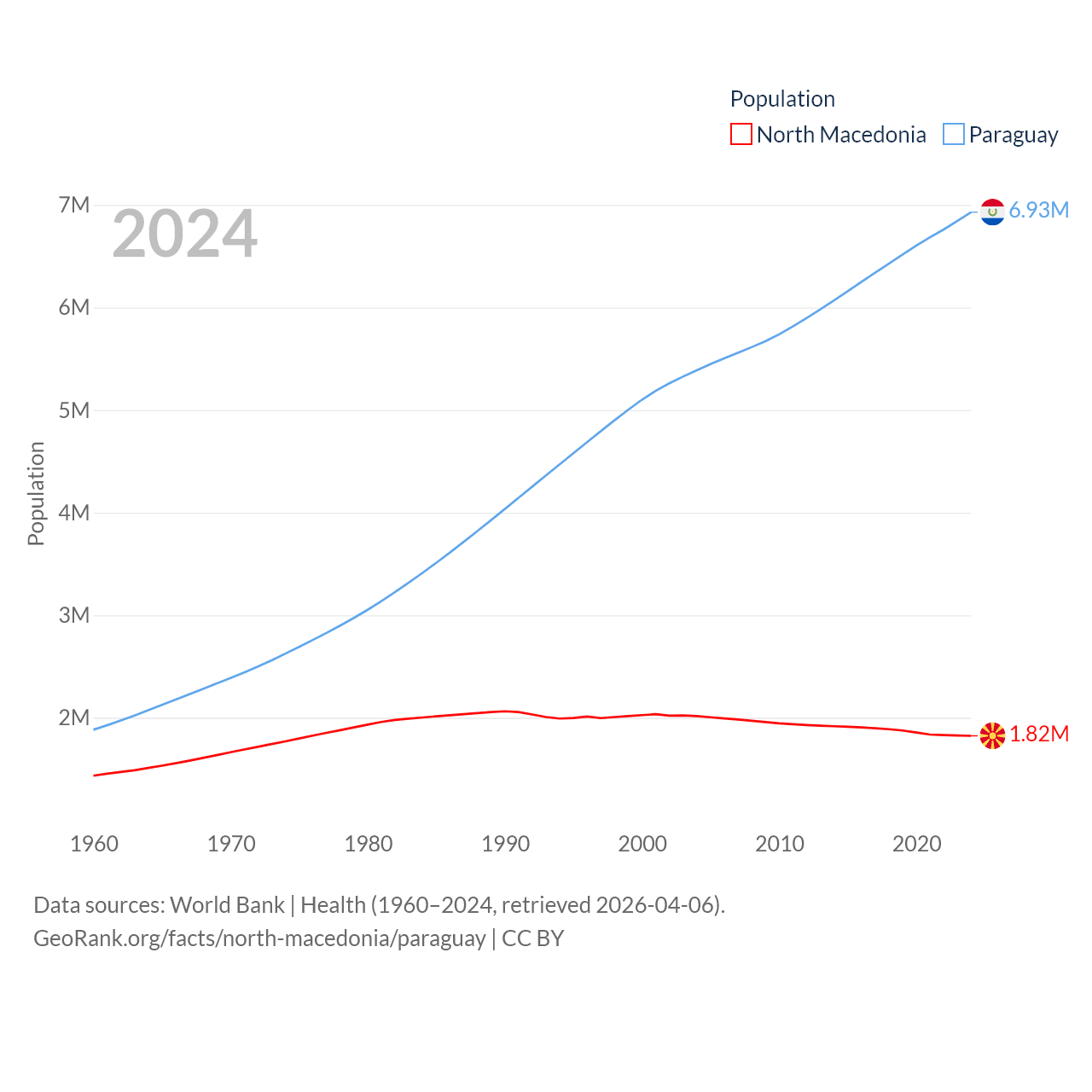 North Macedonia has a population of 1.82M (ranked 150/197), compared with 6.93M in Paraguay (ranked 107/197). North Macedonia's land area is 9,737 sq mi versus 152,901 sq mi for Paraguay (ranked 145th vs. 59th).