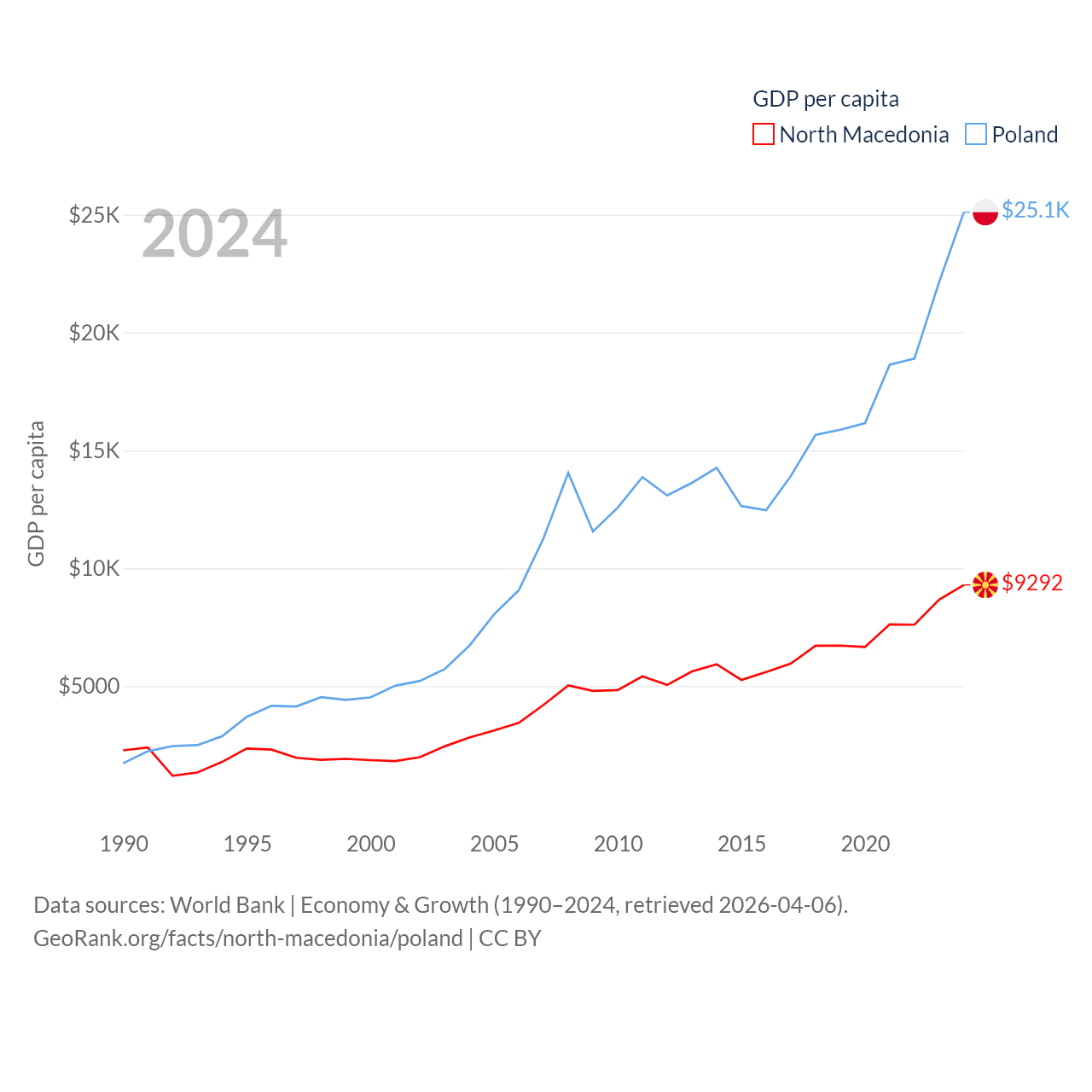By GDP, North Macedonia ranks 138/197 ($17B) and Poland ranks 21/197 ($918B). By GDP per capita, North Macedonia ranks 88/197 ($9,292), while Poland ranks 48/197 ($25,104).