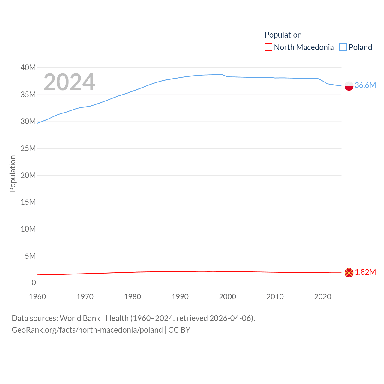 North Macedonia has a population of 1.82M (ranked 150/197), compared with 36.6M in Poland (ranked 42/197). North Macedonia's land area is 9,737 sq mi versus 118,252 sq mi for Poland (ranked 145th vs. 69th).