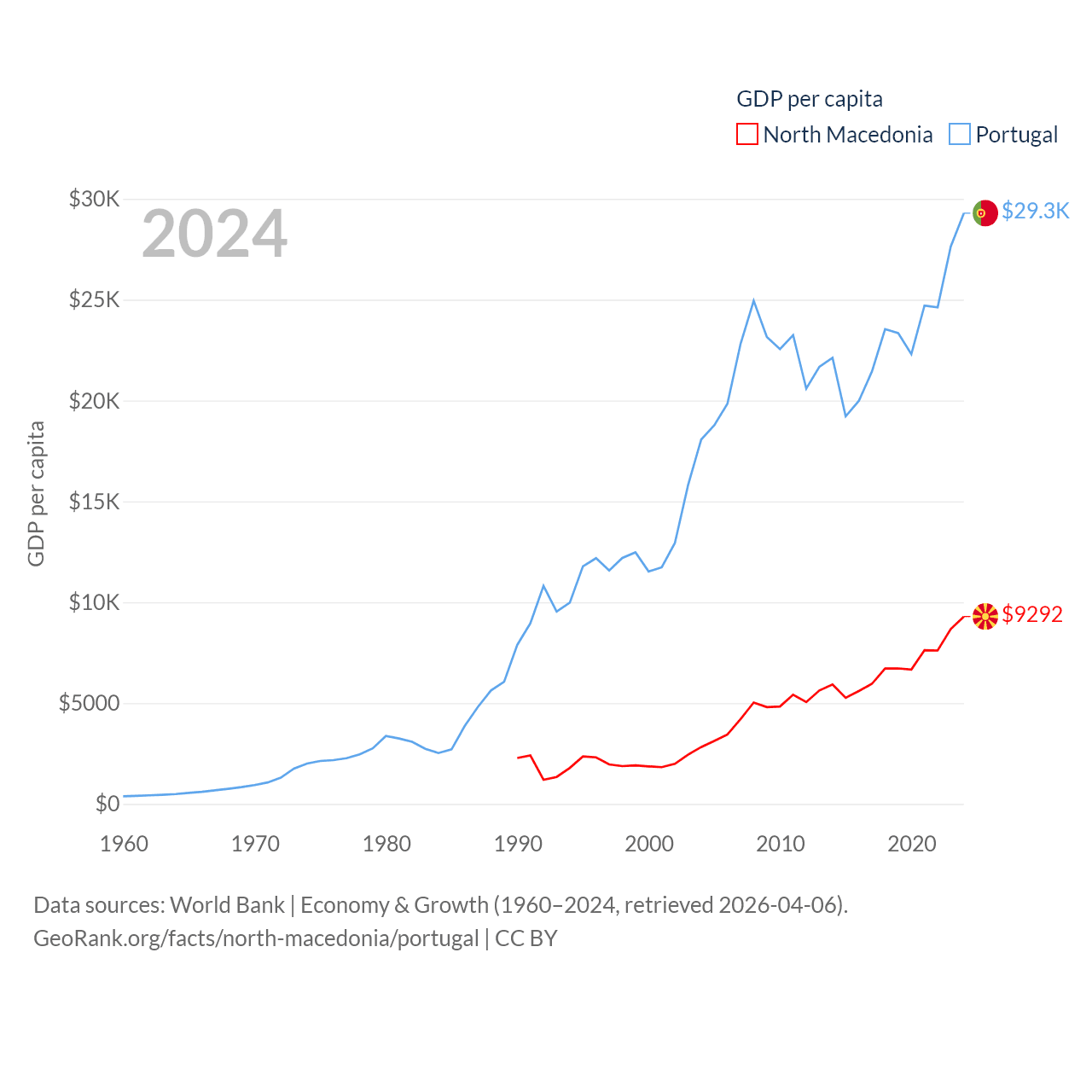 By GDP, North Macedonia ranks 138/197 ($17B) and Portugal ranks 46/197 ($313B). By GDP per capita, North Macedonia ranks 88/197 ($9,292), while Portugal ranks 44/197 ($29,292).