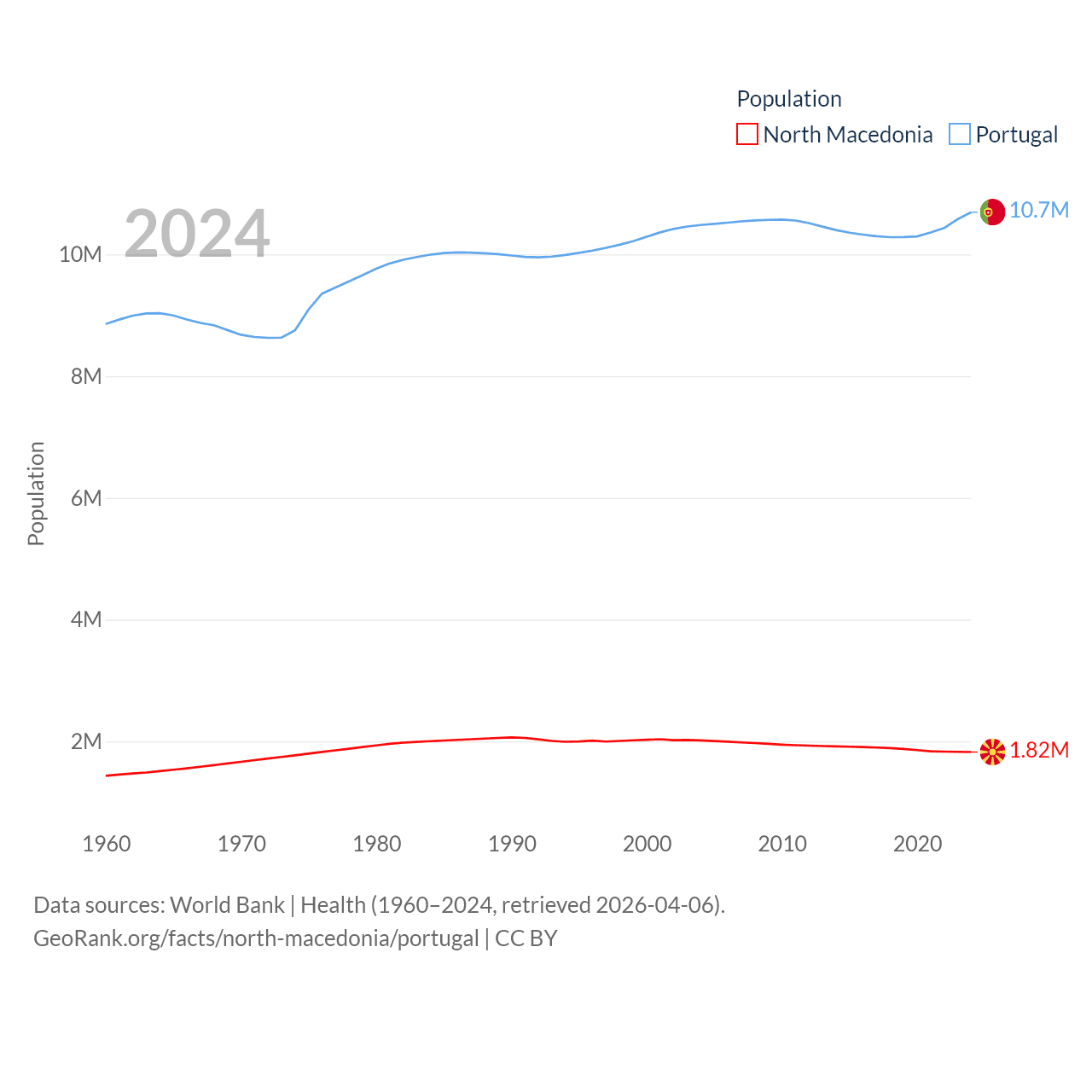 North Macedonia has a population of 1.82M (ranked 150/197), compared with 10.7M in Portugal (ranked 90/197). North Macedonia's land area is 9,737 sq mi versus 35,369 sq mi for Portugal (ranked 145th vs. 108th).