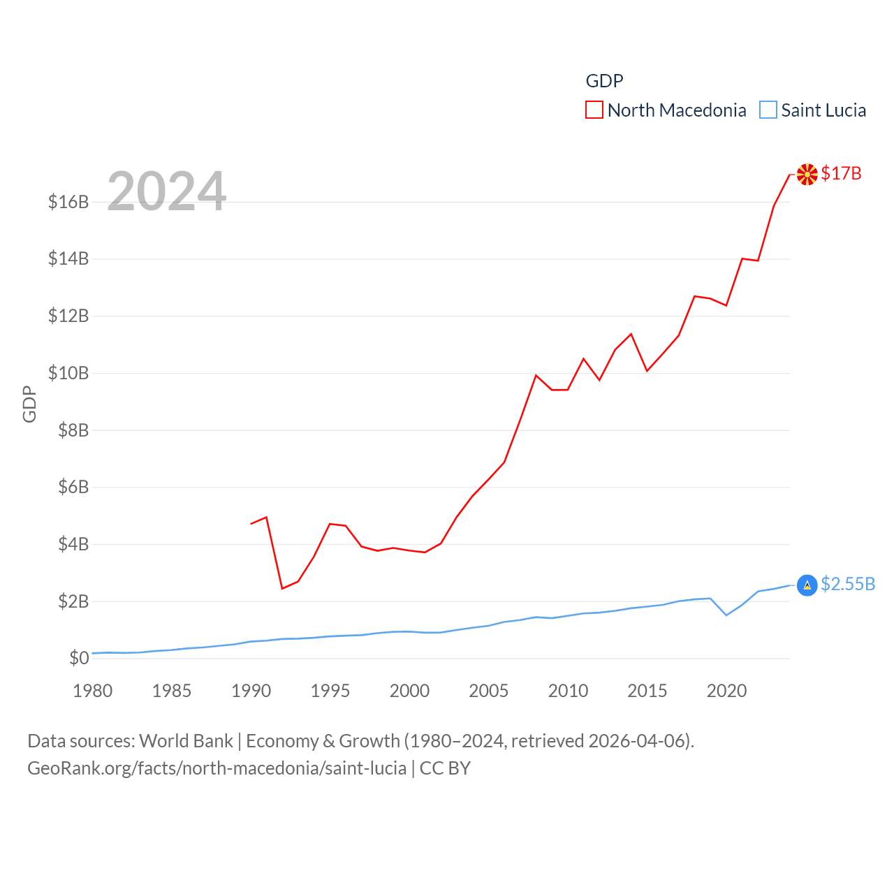 By GDP, North Macedonia ranks 138/197 ($17B) and Saint Lucia ranks 173/197 ($2.55B). By GDP per capita, North Macedonia ranks 88/197 ($9,292), while Saint Lucia ranks 70/197 ($14,182).