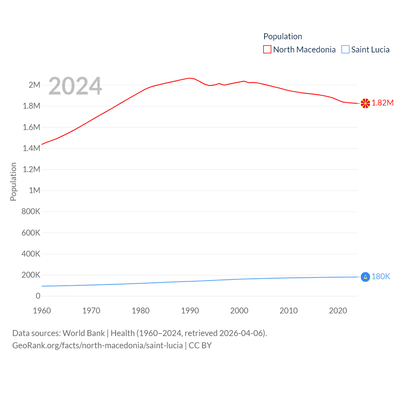 North Macedonia has a population of 1.82M (ranked 150/197), compared with 180K in Saint Lucia (ranked 178/197). North Macedonia's land area is 9,737 sq mi versus 235.5 sq mi for Saint Lucia (ranked 145th vs. 178th).