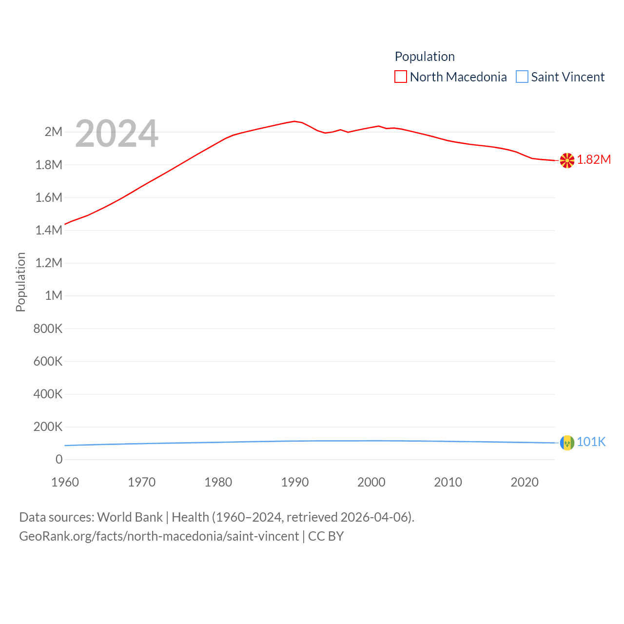 North Macedonia has a population of 1.82M (ranked 150/197), compared with 101K in Saint Vincent (ranked 184/197). North Macedonia's land area is 9,737 sq mi versus 150.6 sq mi for Saint Vincent (ranked 145th vs. 185th).