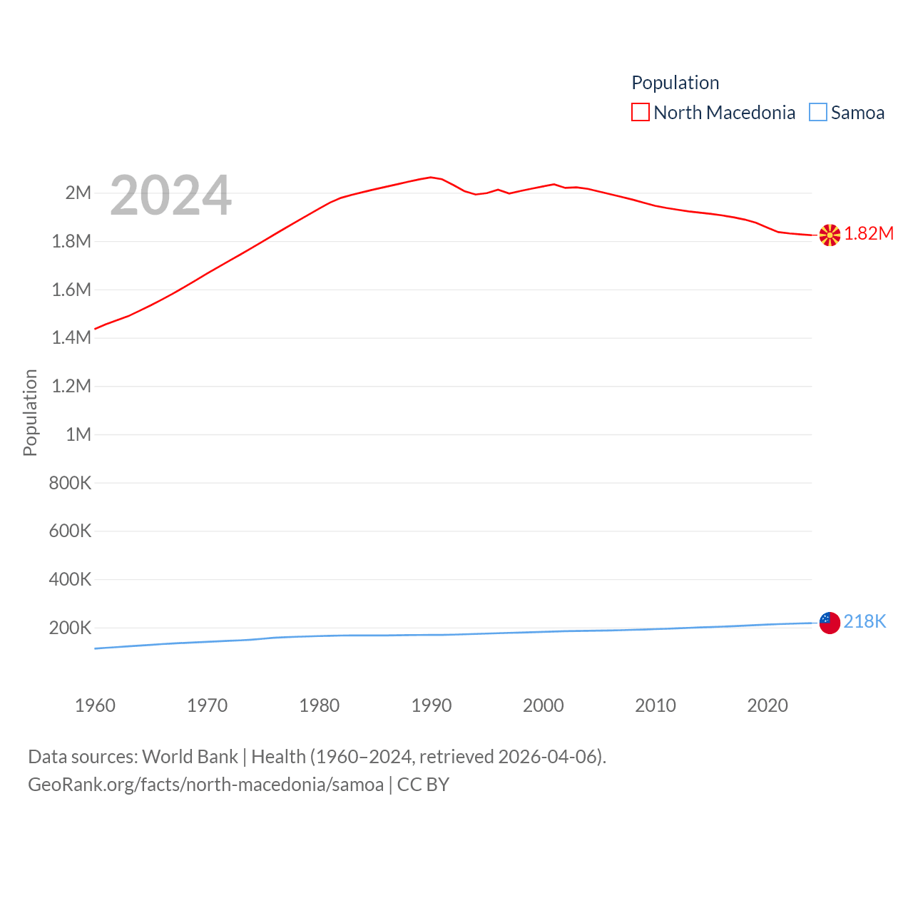 North Macedonia has a population of 1.82M (ranked 150/197), compared with 218K in Samoa (ranked 177/197). North Macedonia's land area is 9,737 sq mi versus 1,073 sq mi for Samoa (ranked 145th vs. 168th).