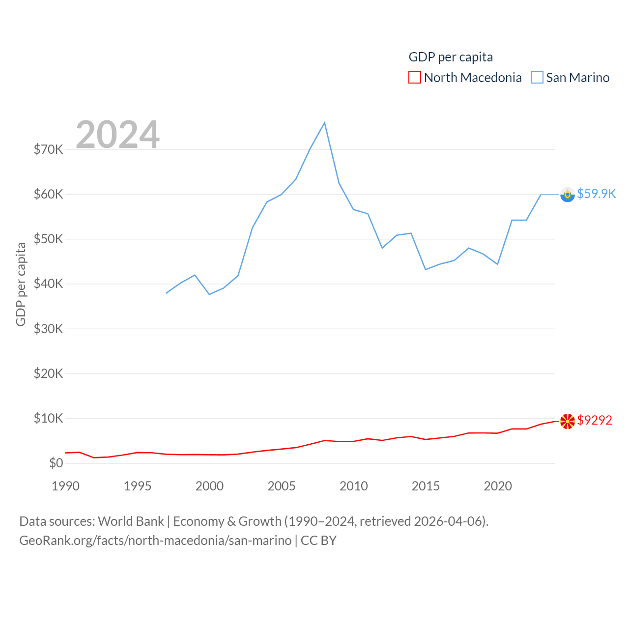 By GDP, North Macedonia ranks 138/197 ($17B) and San Marino ranks 180/197 ($2.03B). By GDP per capita, North Macedonia ranks 88/197 ($9,292), while San Marino ranks 15/197 ($59,880).