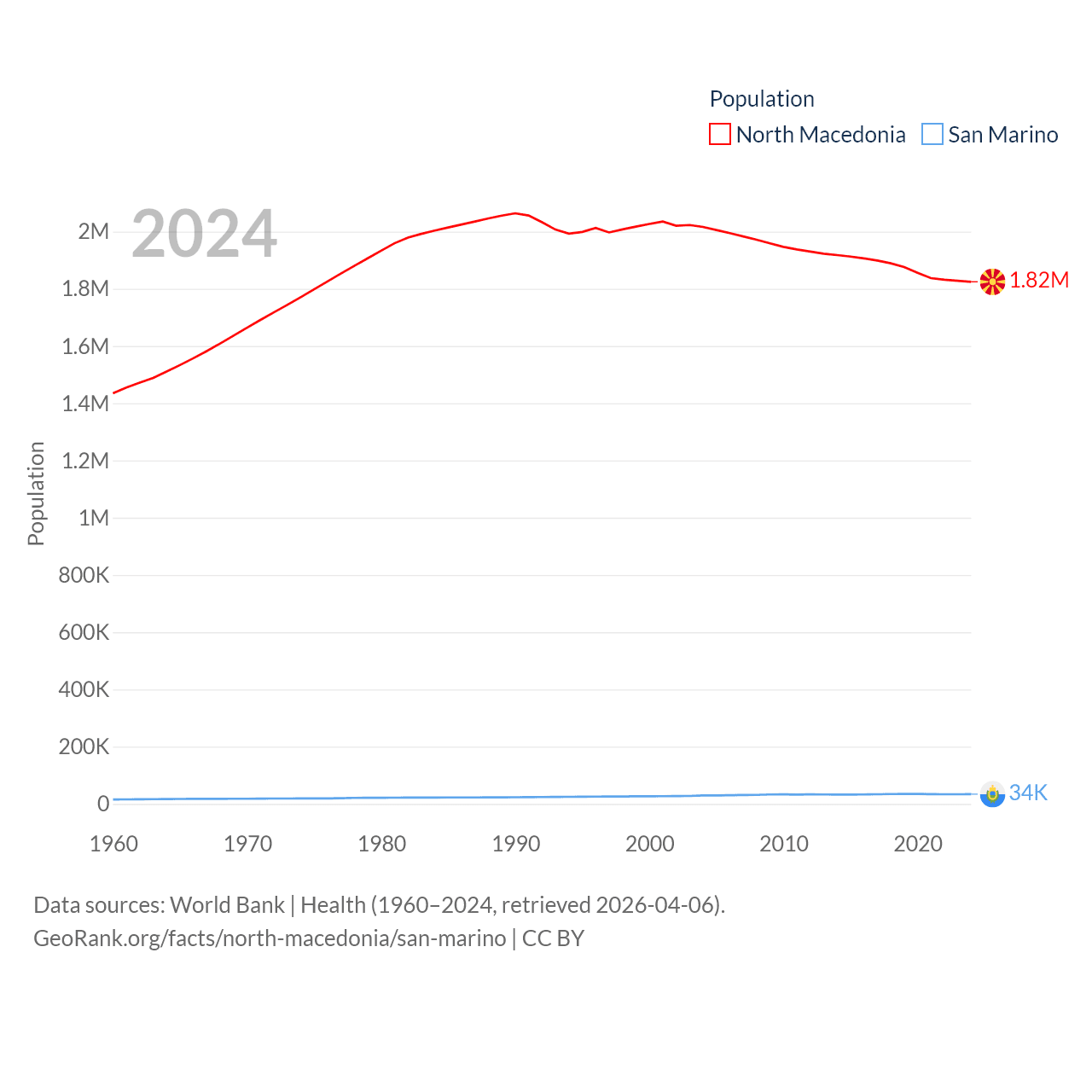 North Macedonia has a population of 1.82M (ranked 150/197), compared with 34K in San Marino (ranked 193/197). North Macedonia's land area is 9,737 sq mi versus 23.2 sq mi for San Marino (ranked 145th vs. 193rd).