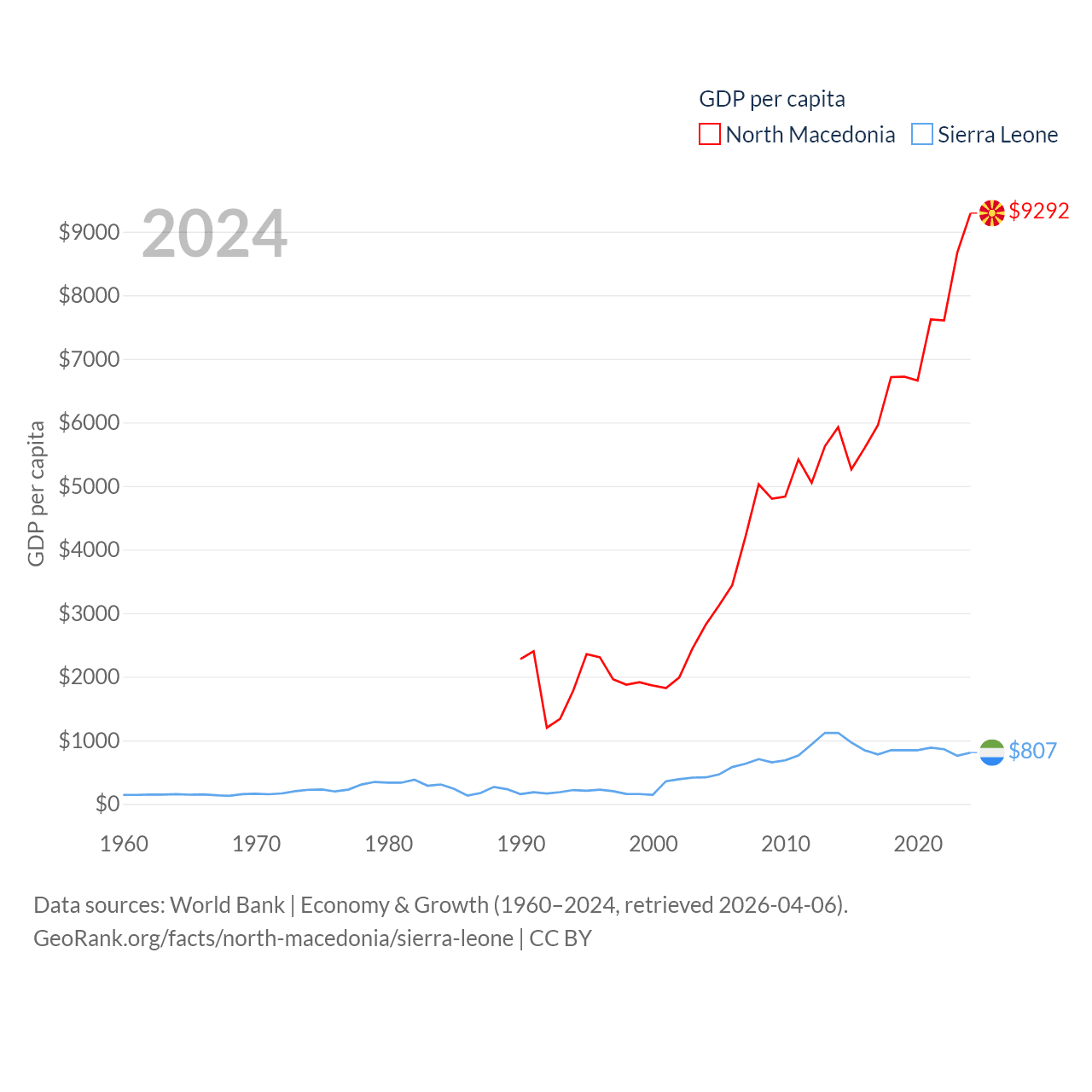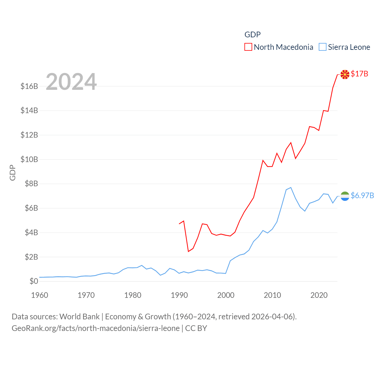 By GDP, North Macedonia ranks 138/197 ($17B) and Sierra Leone ranks 160/197 ($6.97B). By GDP per capita, North Macedonia ranks 88/197 ($9,292), while Sierra Leone ranks 186/197 ($807).