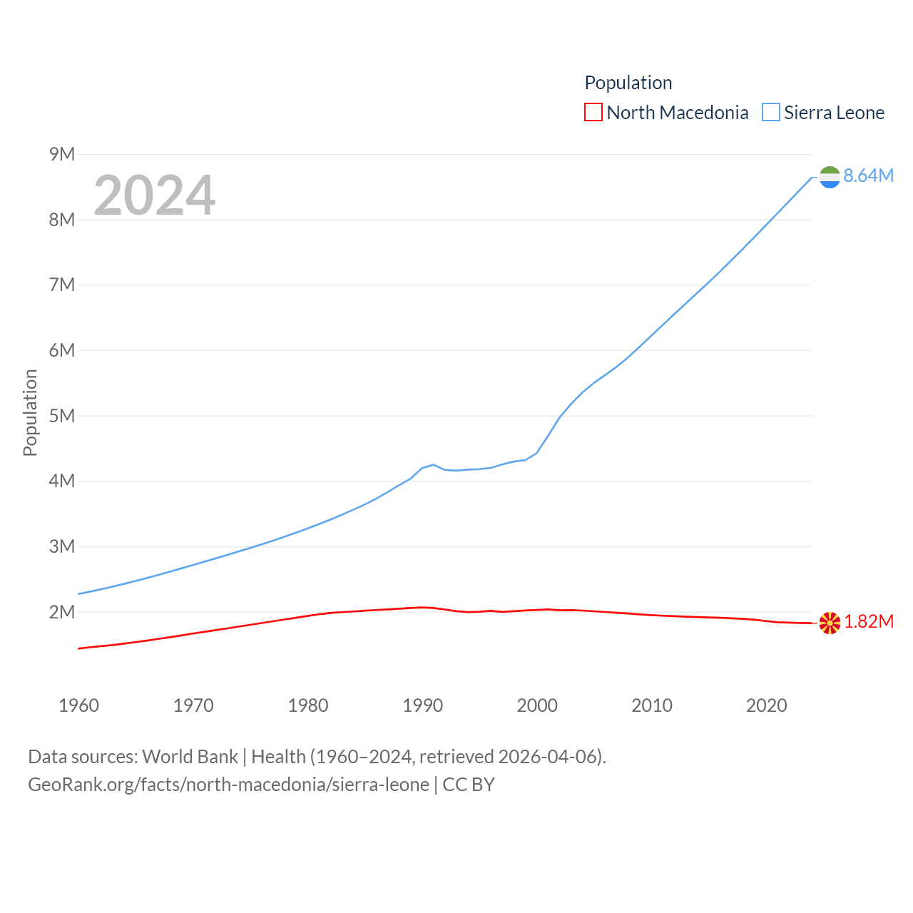 North Macedonia has a population of 1.82M (ranked 150/197), compared with 8.64M in Sierra Leone (ranked 102/197). North Macedonia's land area is 9,737 sq mi versus 27,869 sq mi for Sierra Leone (ranked 145th vs. 116th).