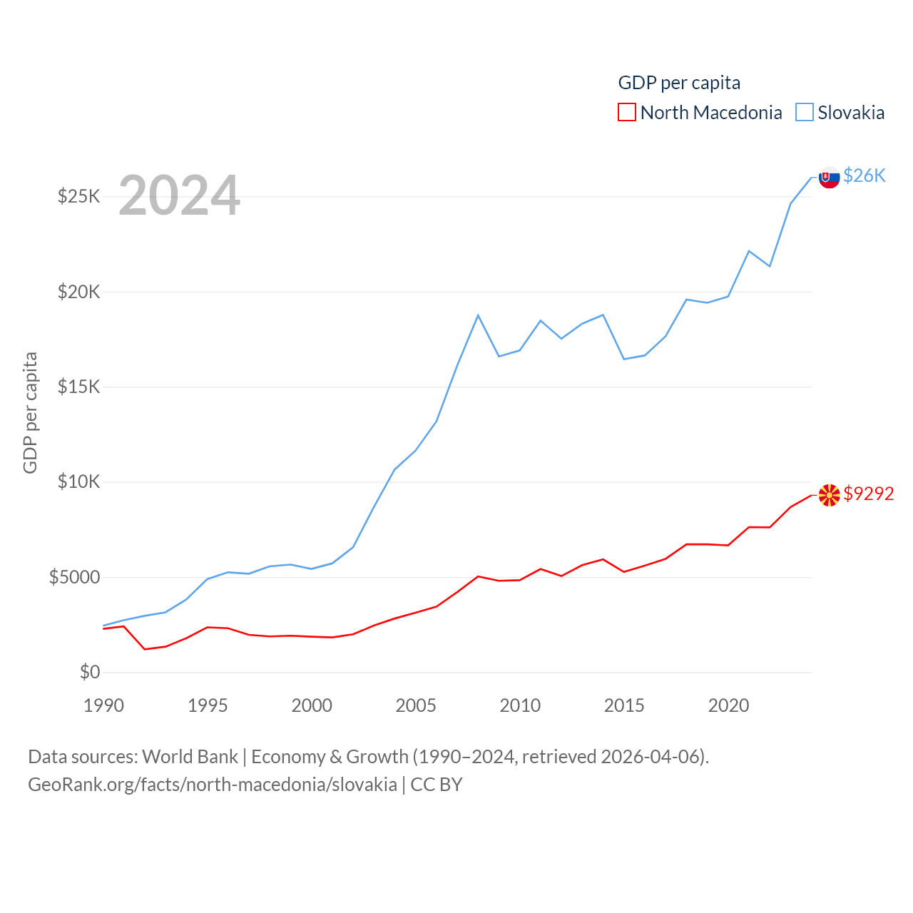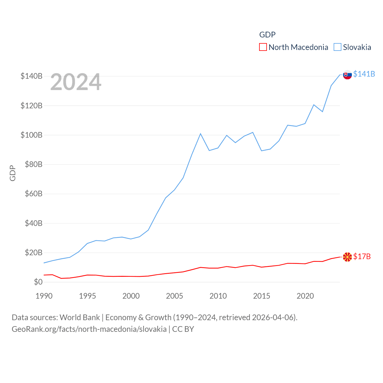 By GDP, North Macedonia ranks 138/197 ($17B) and Slovakia ranks 61/197 ($141B). By GDP per capita, North Macedonia ranks 88/197 ($9,292), while Slovakia ranks 47/197 ($25,993).