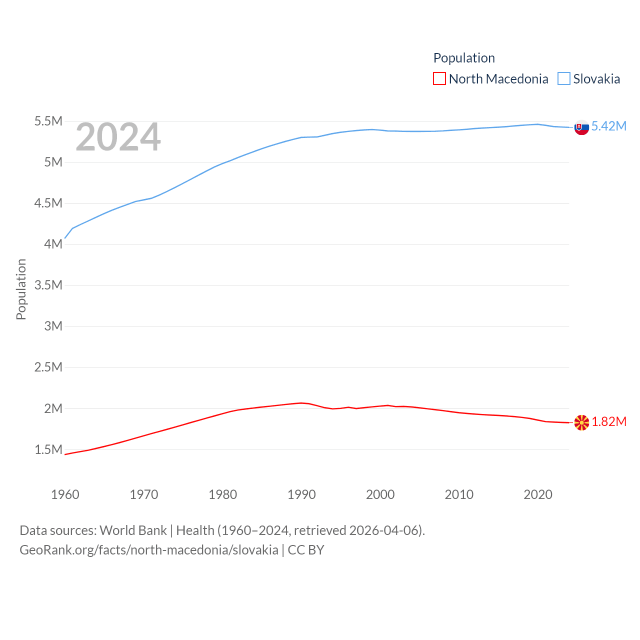 North Macedonia has a population of 1.82M (ranked 150/197), compared with 5.42M in Slovakia (ranked 119/197). North Macedonia's land area is 9,737 sq mi versus 18,564 sq mi for Slovakia (ranked 145th vs. 128th).