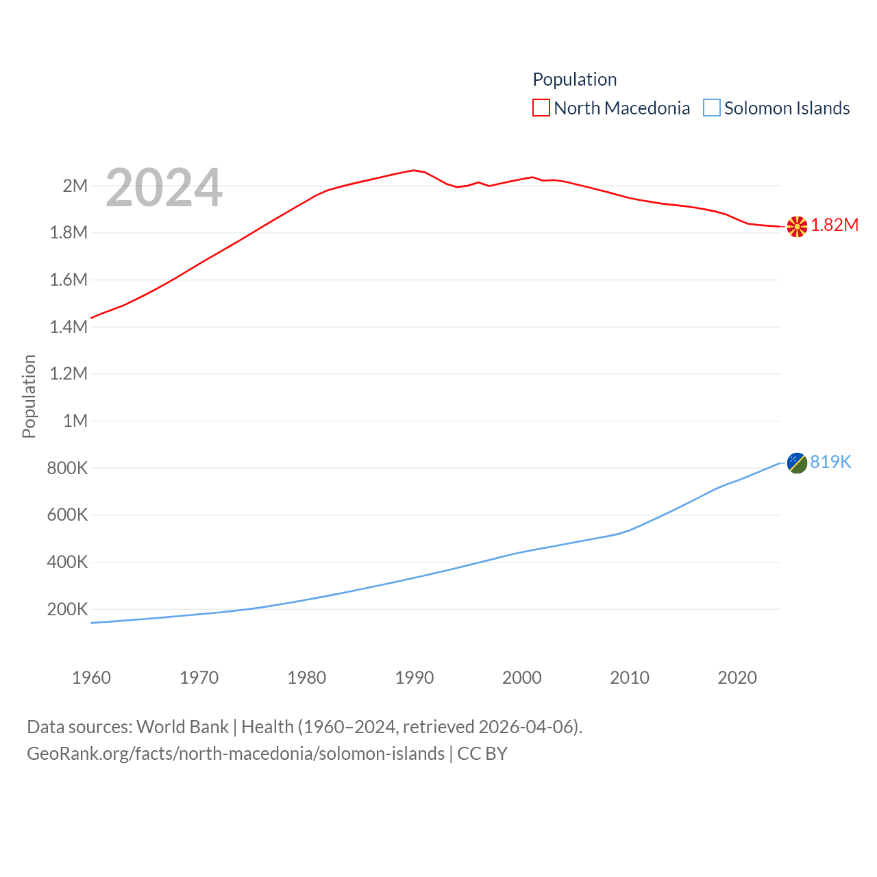 North Macedonia has a population of 1.82M (ranked 150/197), compared with 819K in The Solomon Islands (ranked 162/197). North Macedonia's land area is 9,737 sq mi versus 10,807 sq mi for The Solomon Islands (ranked 145th vs. 141st).