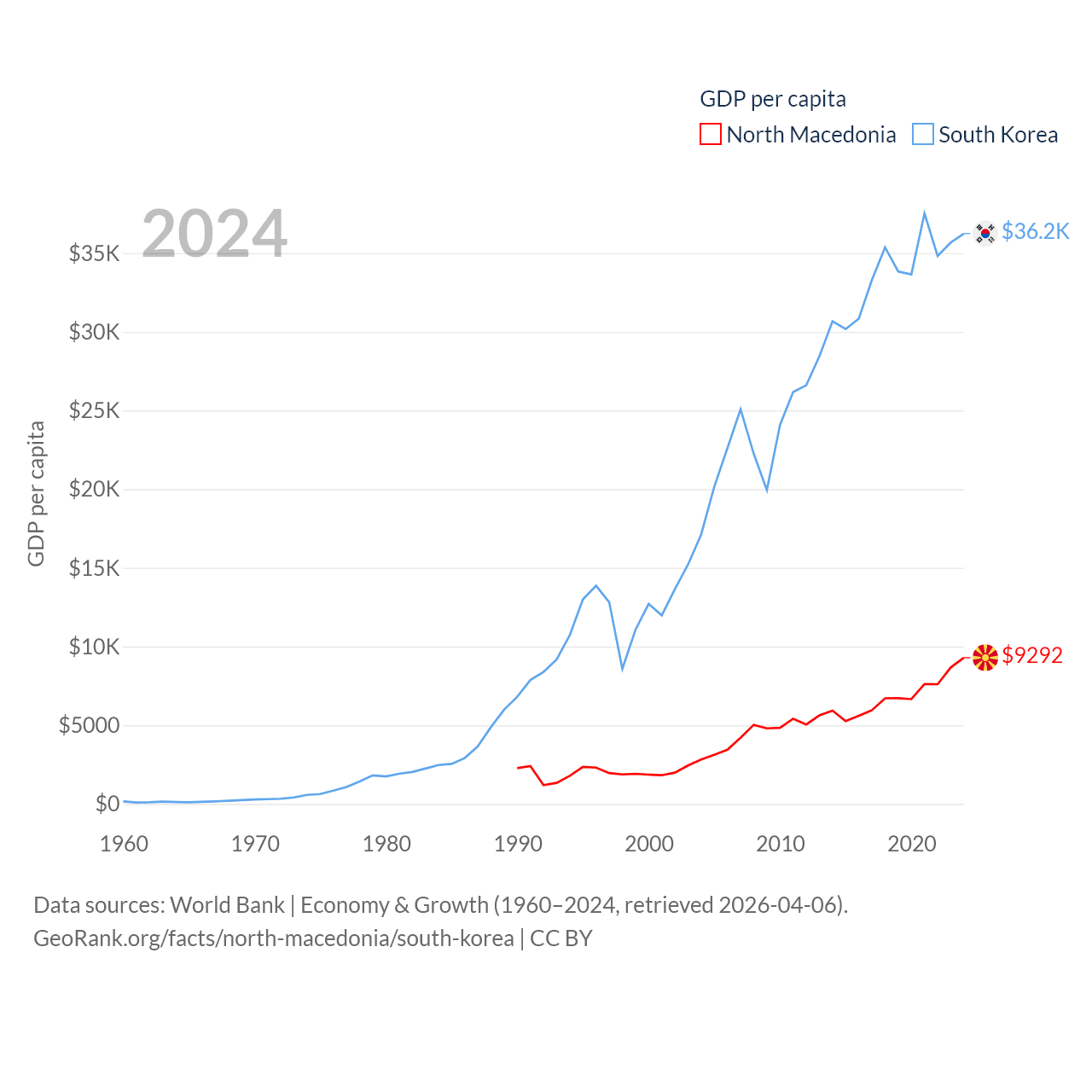 By GDP, North Macedonia ranks 138/197 ($17B) and South Korea ranks 12/197 ($1.88T). By GDP per capita, North Macedonia ranks 88/197 ($9,292), while South Korea ranks 31/197 ($36,239).