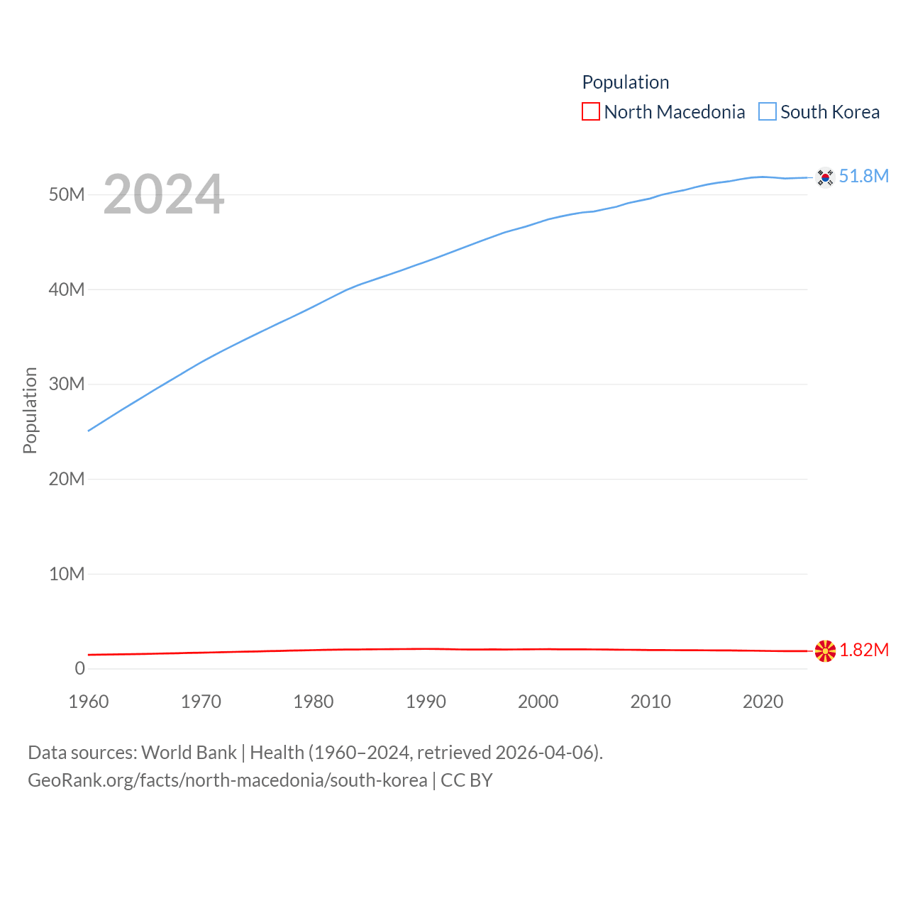 North Macedonia has a population of 1.82M (ranked 150/197), compared with 51.8M in South Korea (ranked 29/197). North Macedonia's land area is 9,737 sq mi versus 37,684 sq mi for South Korea (ranked 145th vs. 105th).