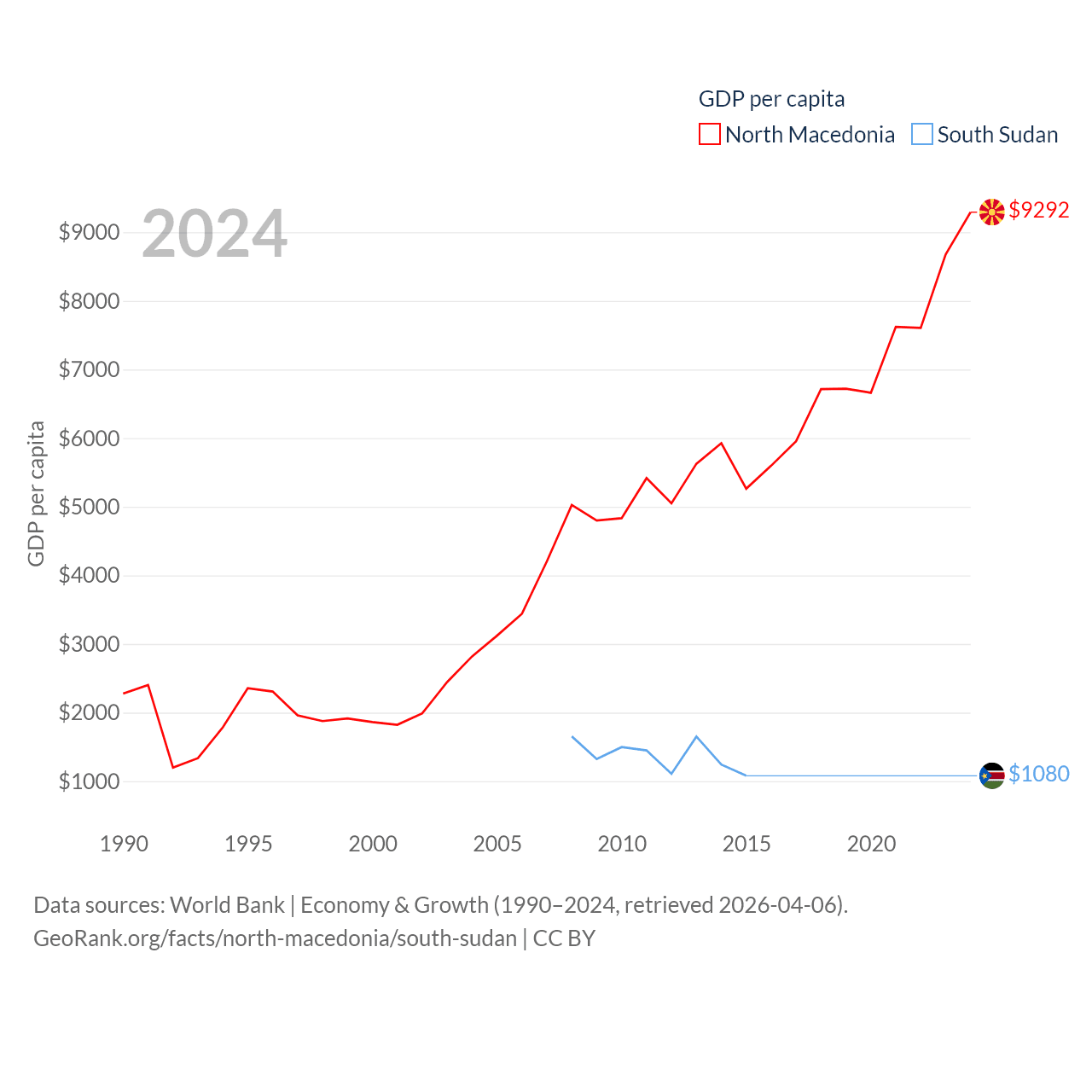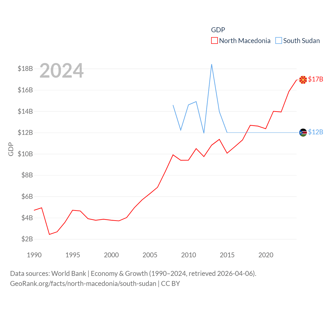 By GDP, North Macedonia ranks 138/197 ($17B) and South Sudan ranks 149/197 ($12B). By GDP per capita, North Macedonia ranks 88/197 ($9,292), while South Sudan ranks 175/197 ($1,080).