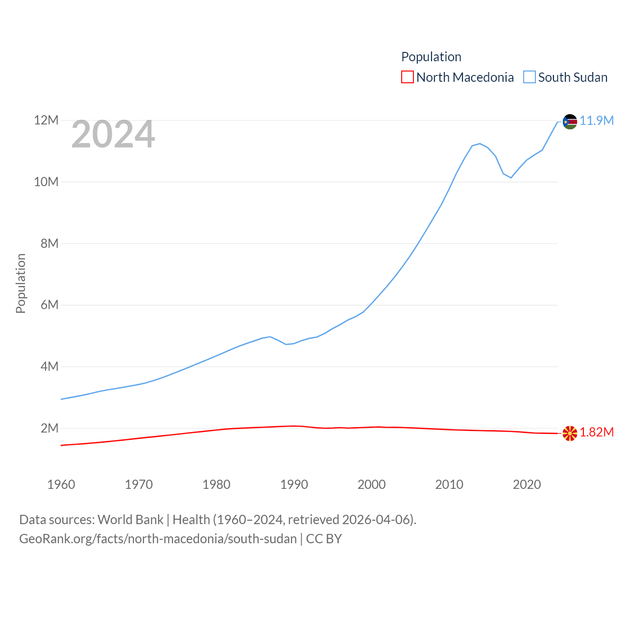 North Macedonia has a population of 1.82M (ranked 150/197), compared with 11.9M in South Sudan (ranked 81/197). North Macedonia's land area is 9,737 sq mi versus 243,990 sq mi for South Sudan (ranked 145th vs. 41st).