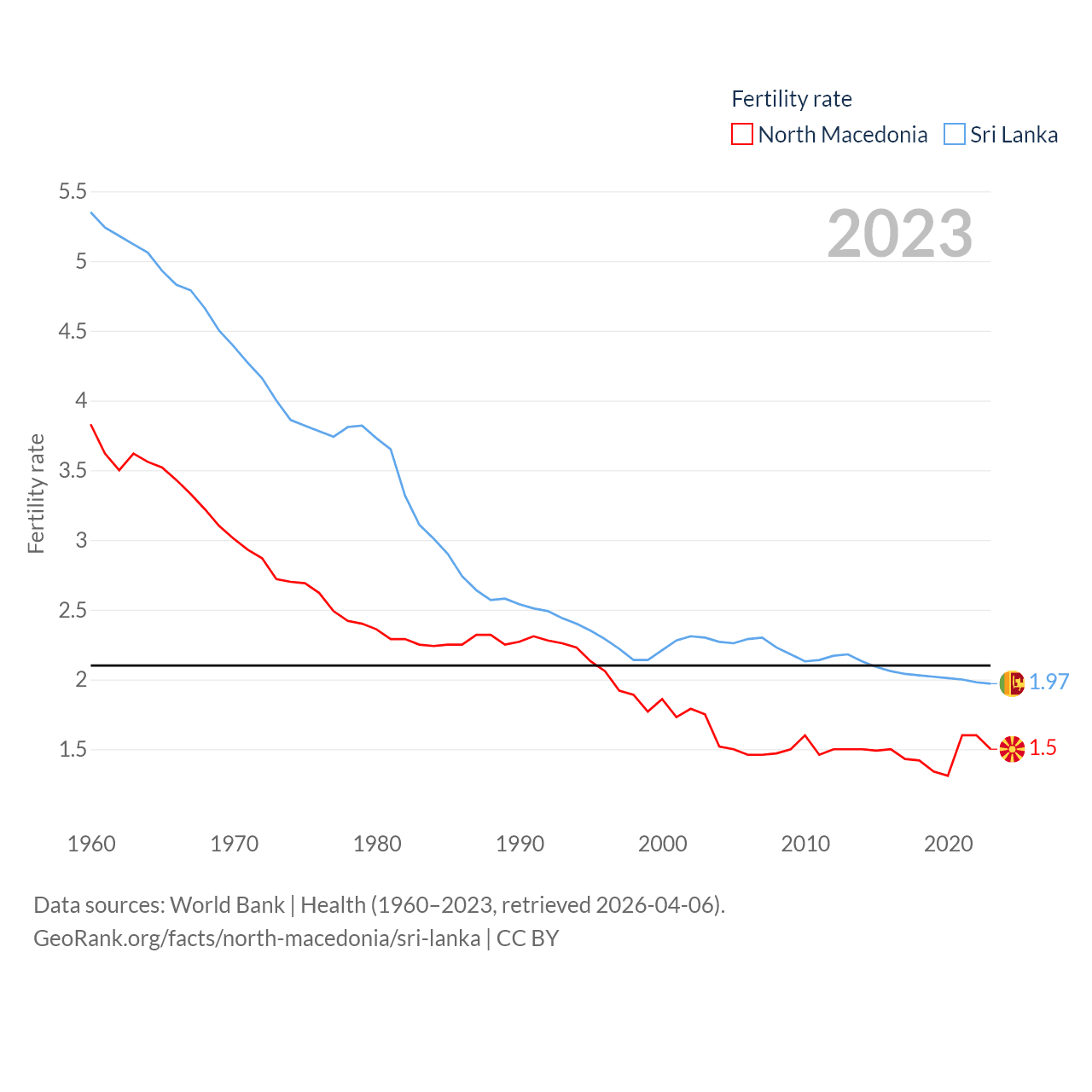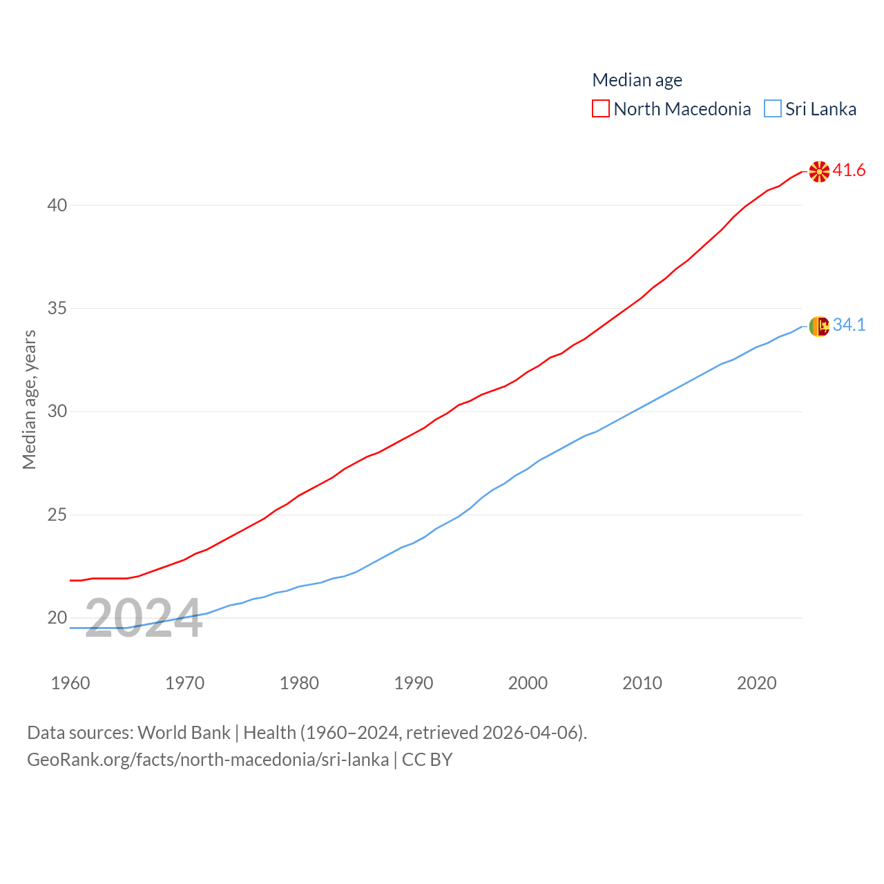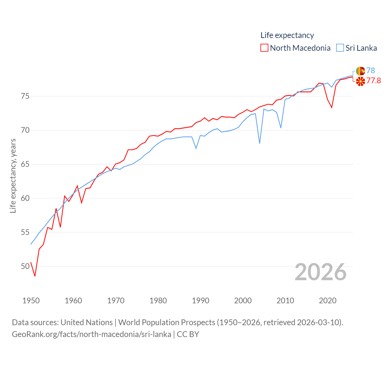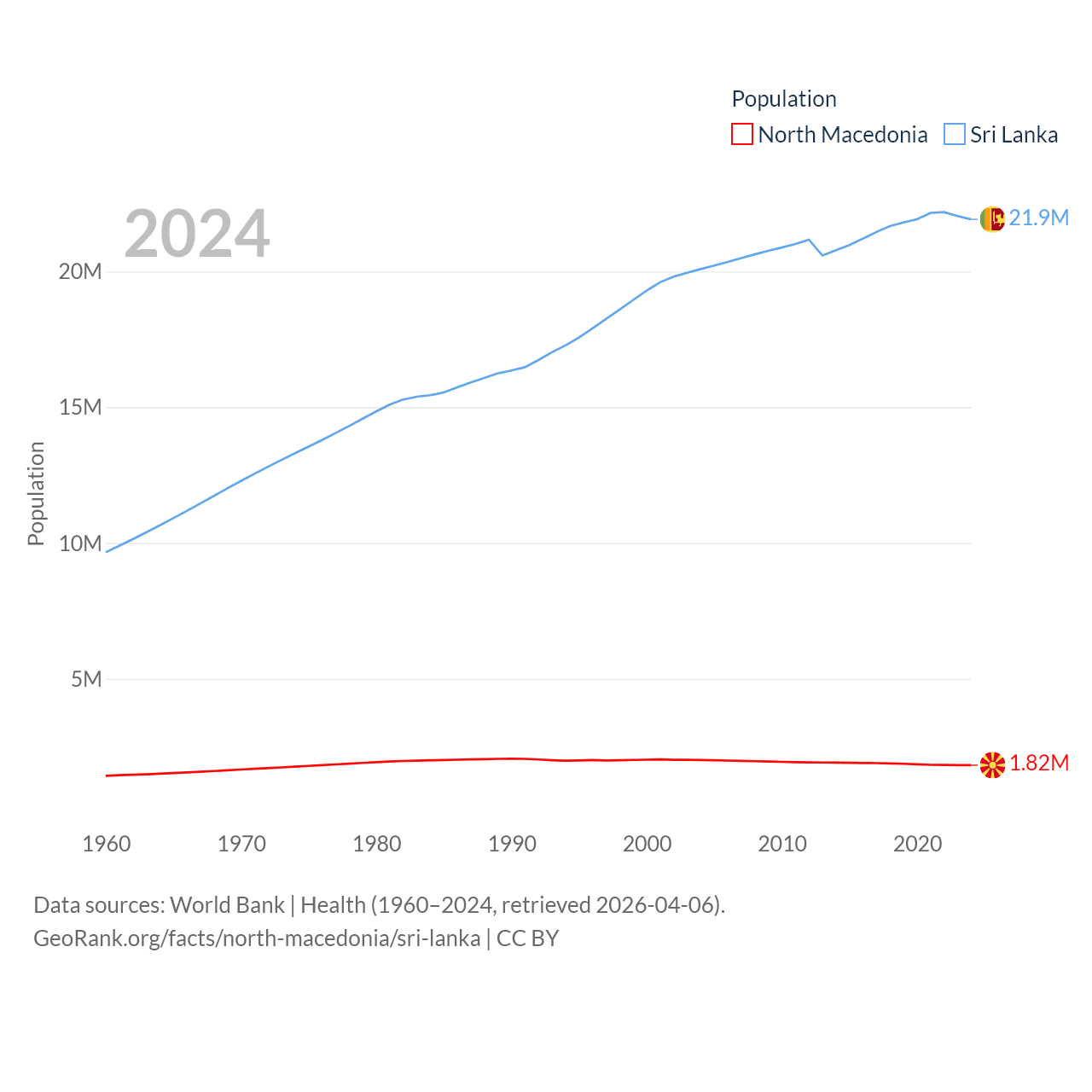 North Macedonia has a population of 1.82M (ranked 150/197), compared with 21.9M in Sri Lanka (ranked 61/197). North Macedonia's land area is 9,737 sq mi versus 23,884 sq mi for Sri Lanka (ranked 145th vs. 122nd).