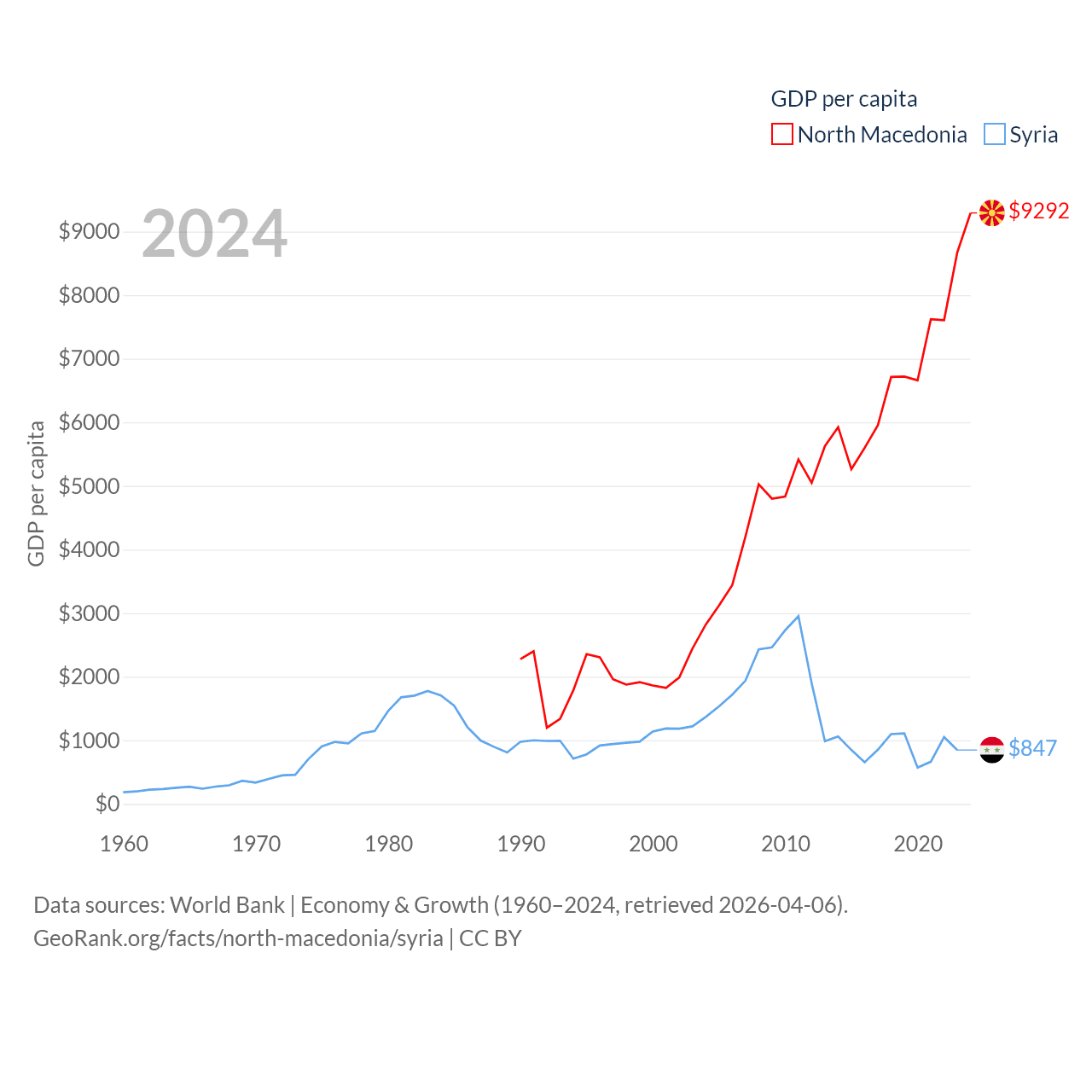 By GDP, North Macedonia ranks 138/197 ($17B) and Syria ranks 129/197 ($20B). By GDP per capita, North Macedonia ranks 88/197 ($9,292), while Syria ranks 185/197 ($847).