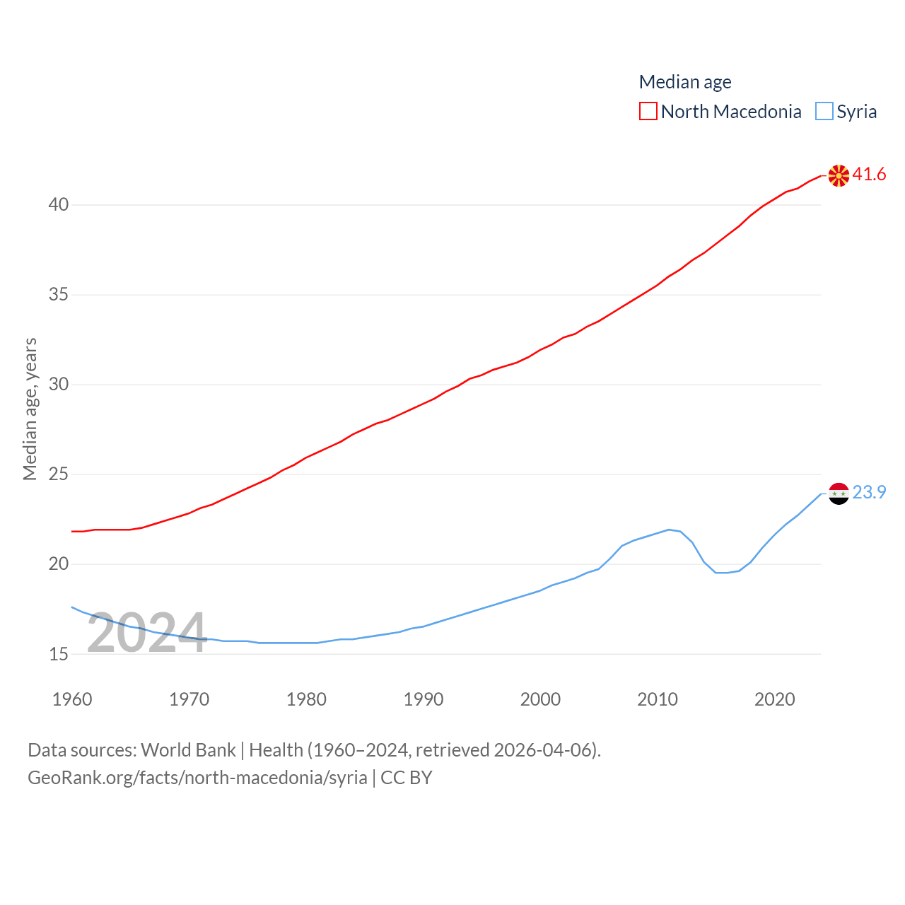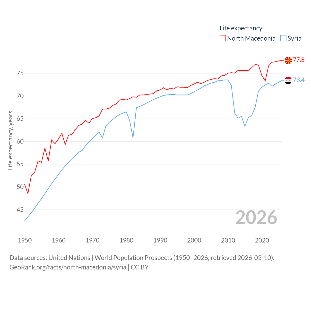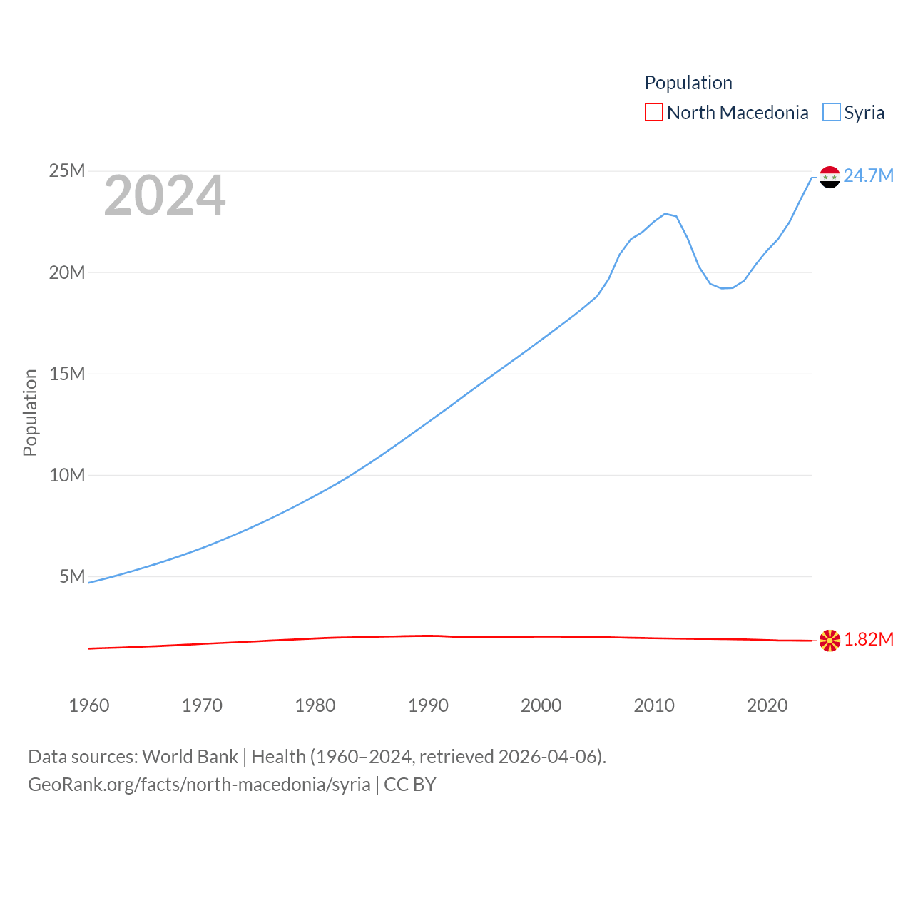 North Macedonia has a population of 1.82M (ranked 150/197), compared with 24.7M in Syria (ranked 57/197). North Macedonia's land area is 9,737 sq mi versus 70,900 sq mi for Syria (ranked 145th vs. 87th).