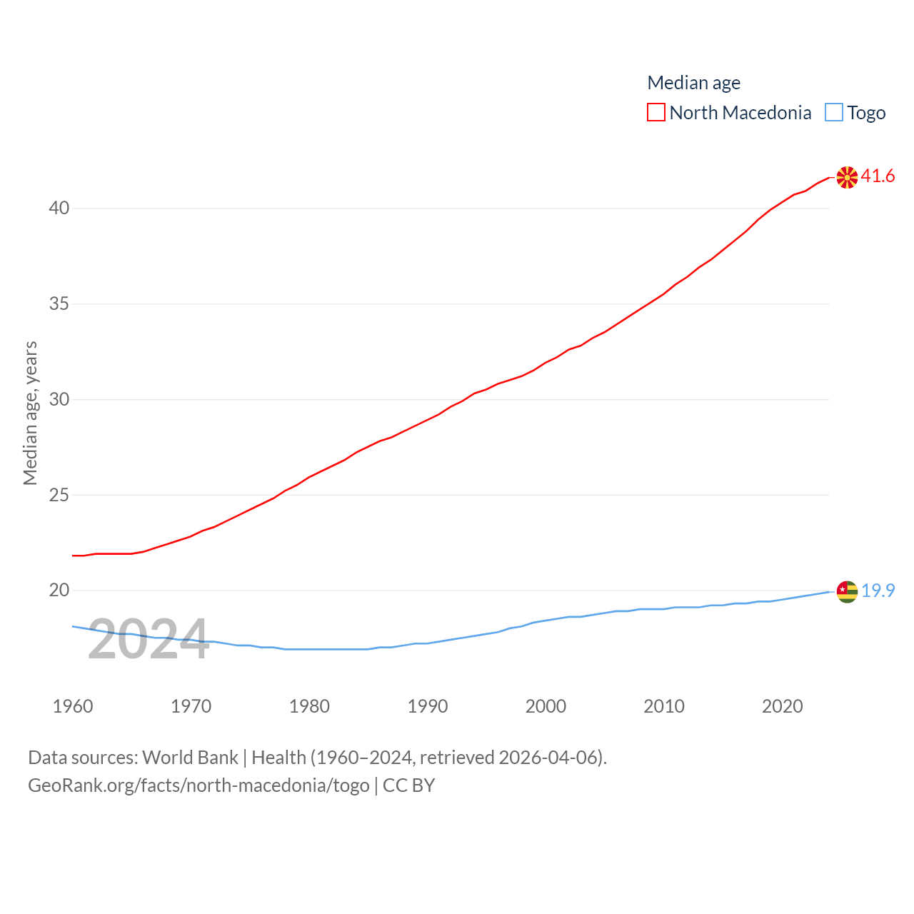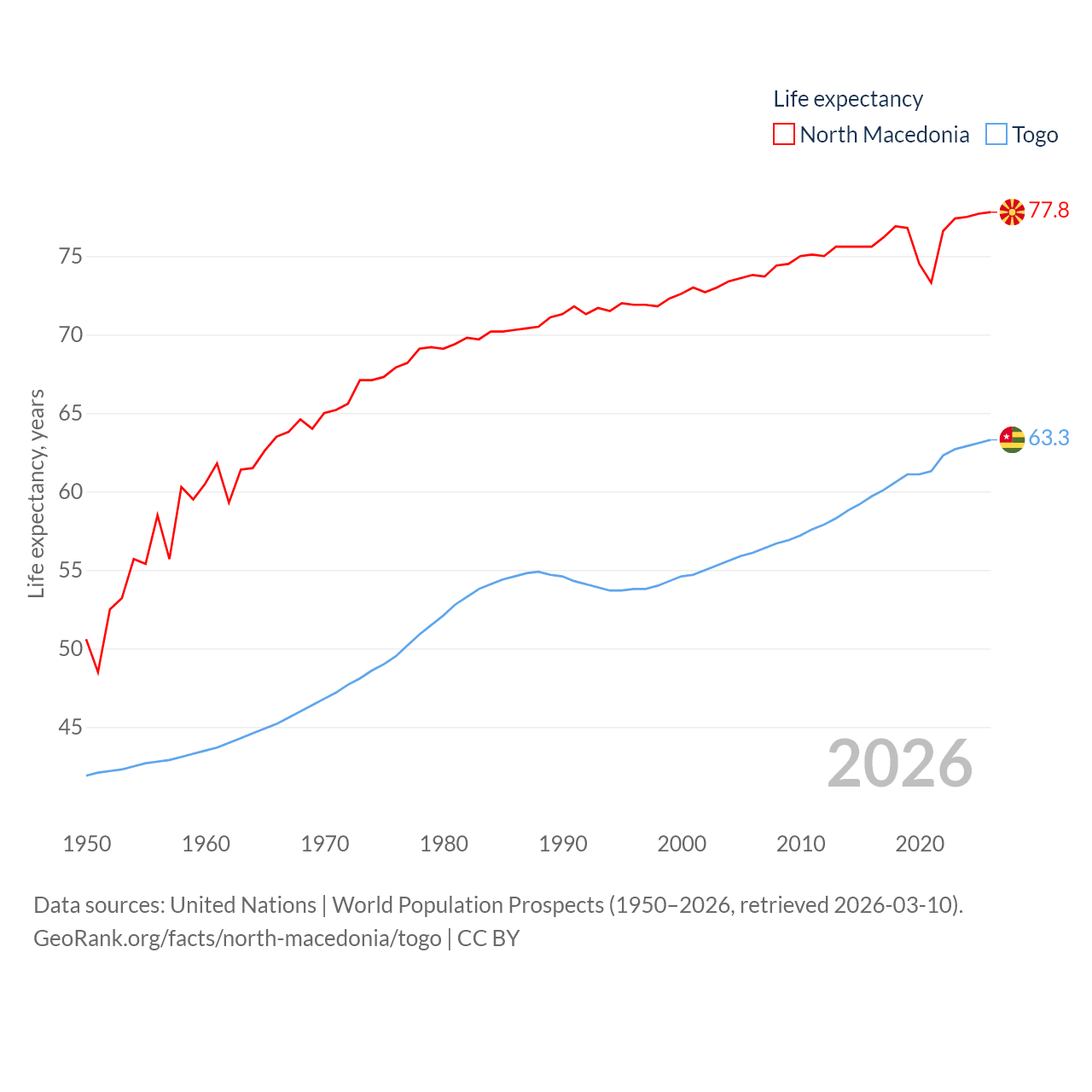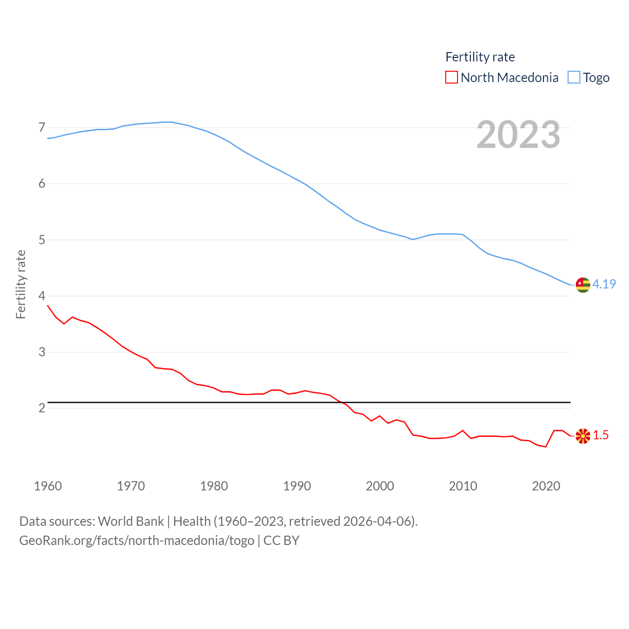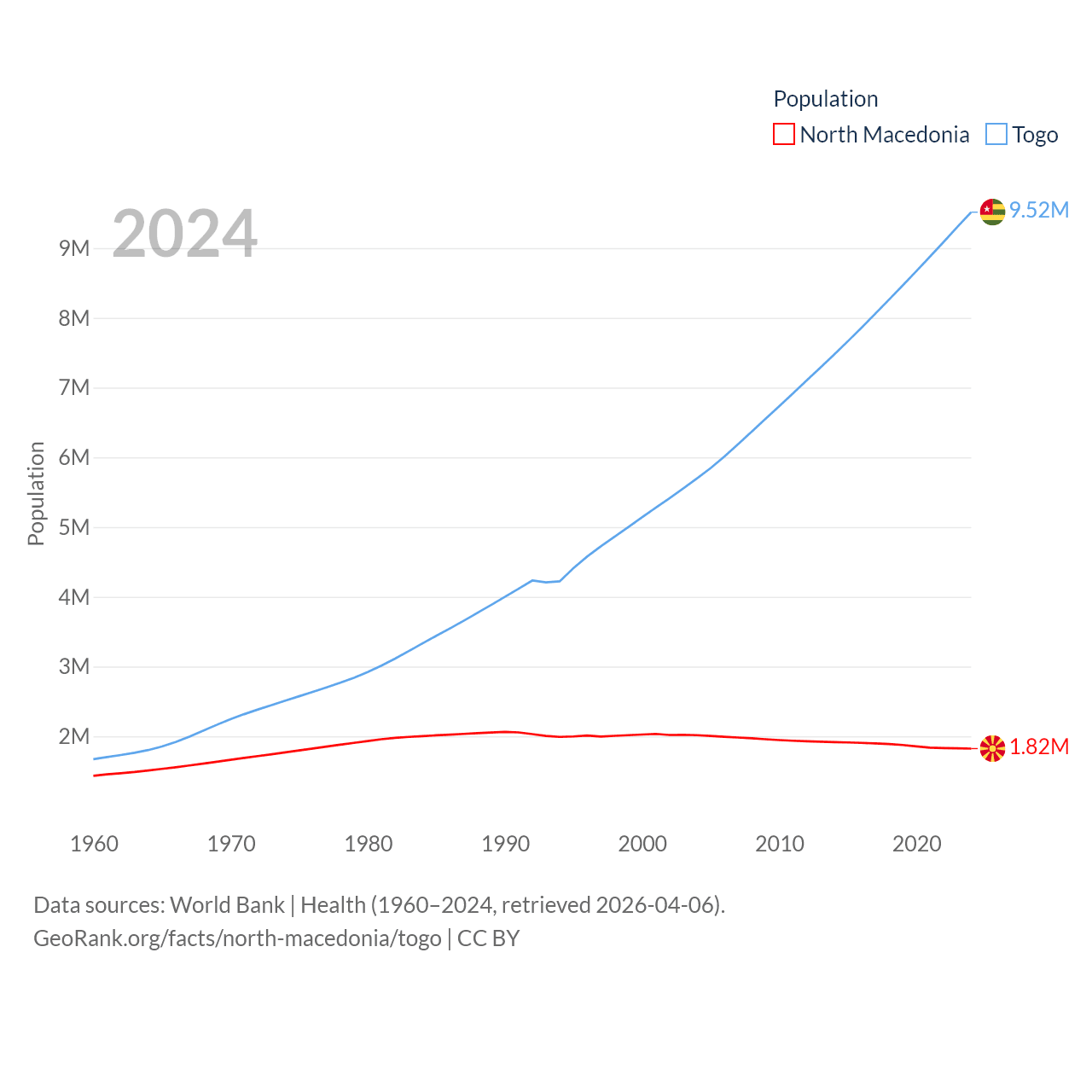 North Macedonia has a population of 1.82M (ranked 150/197), compared with 9.52M in Togo (ranked 98/197). North Macedonia's land area is 9,737 sq mi versus 21,000 sq mi for Togo (ranked 145th vs. 124th).