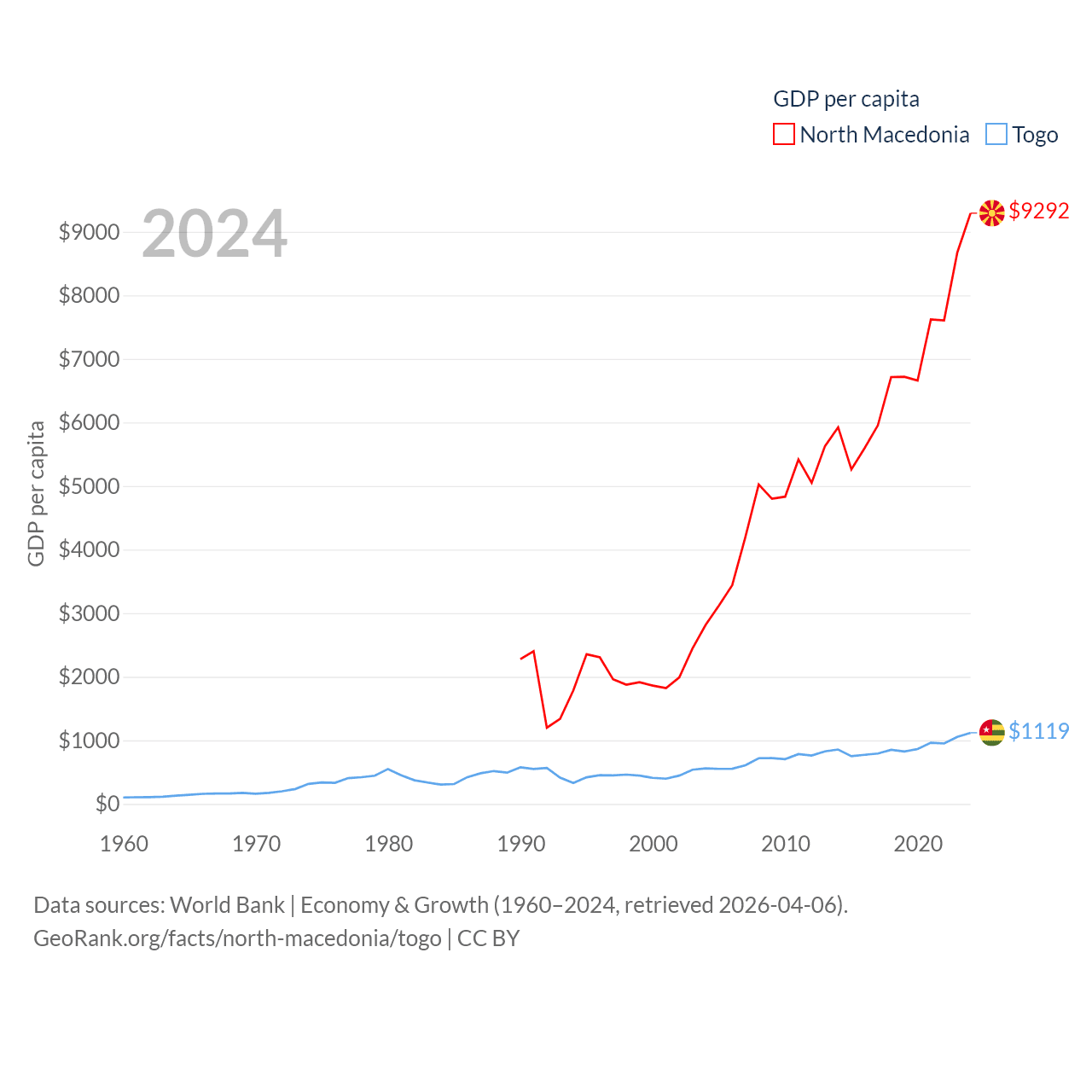By GDP, North Macedonia ranks 138/197 ($17B) and Togo ranks 154/197 ($10.7B). By GDP per capita, North Macedonia ranks 88/197 ($9,292), while Togo ranks 172/197 ($1,119).
