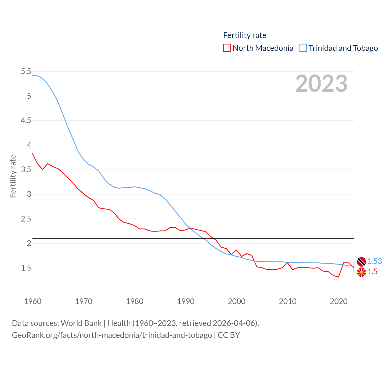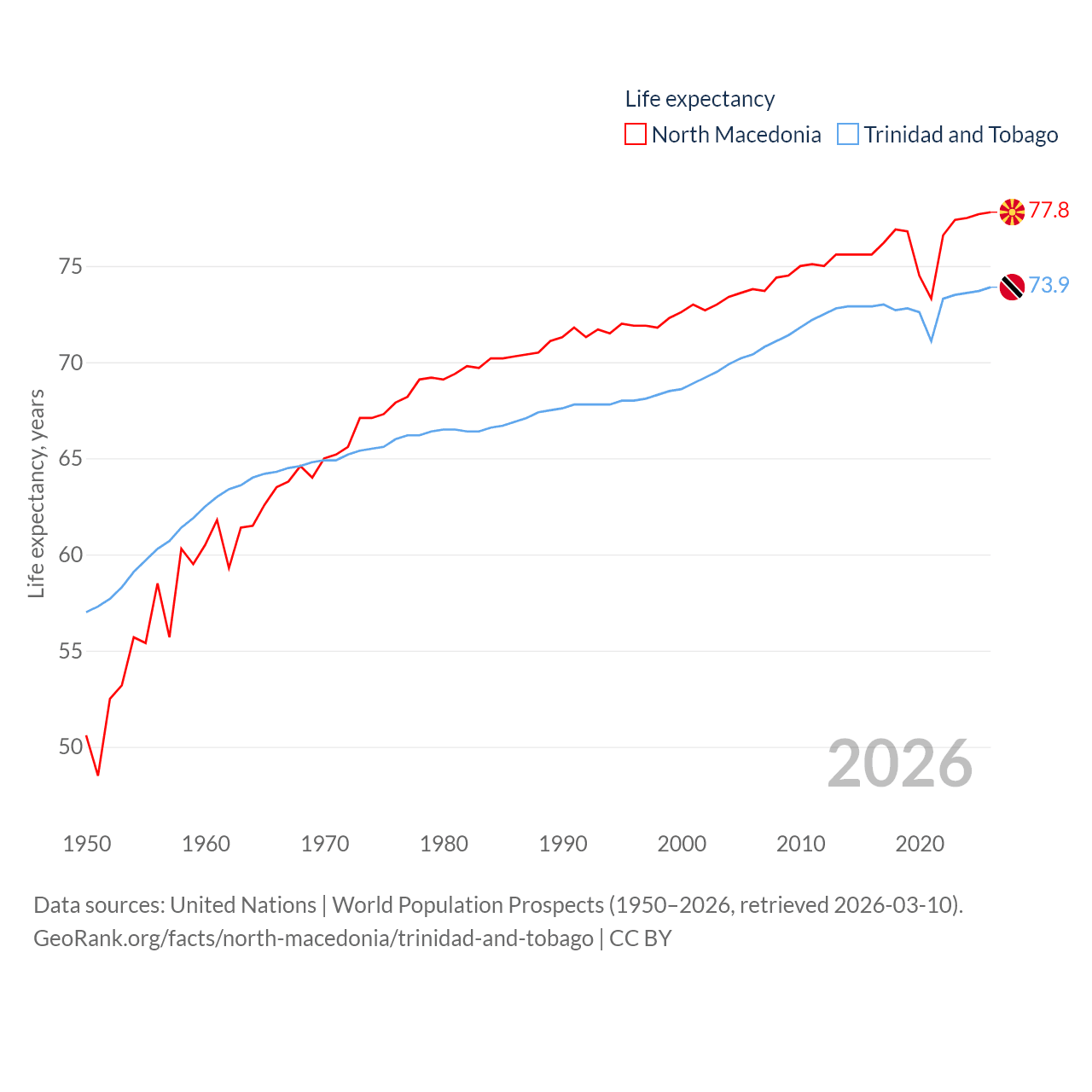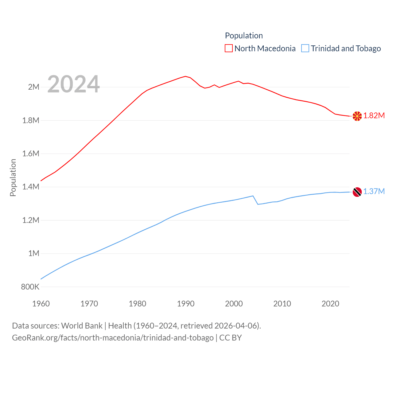 North Macedonia has a population of 1.82M (ranked 150/197), compared with 1.37M in Trinidad and Tobago (ranked 154/197). North Macedonia's land area is 9,737 sq mi versus 1,981 sq mi for Trinidad and Tobago (ranked 145th vs. 166th).