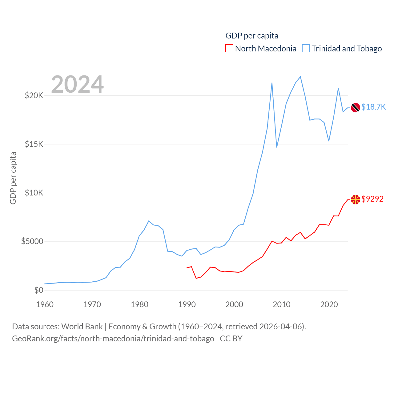 By GDP, North Macedonia ranks 138/197 ($17B) and Trinidad and Tobago ranks 115/197 ($25.6B). By GDP per capita, North Macedonia ranks 88/197 ($9,292), while Trinidad and Tobago ranks 61/197 ($18,733).