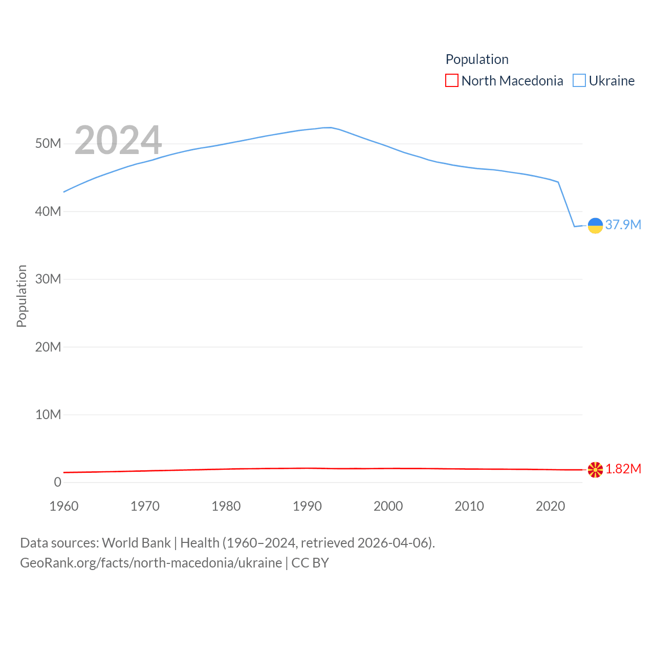 North Macedonia has a population of 1.82M (ranked 150/197), compared with 37.9M in Ukraine (ranked 41/197). North Macedonia's land area is 9,737 sq mi versus 223,708 sq mi for Ukraine (ranked 145th vs. 46th).