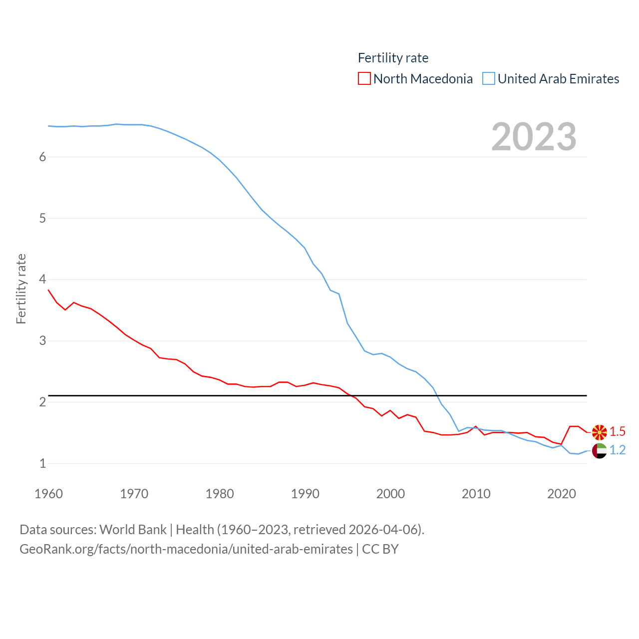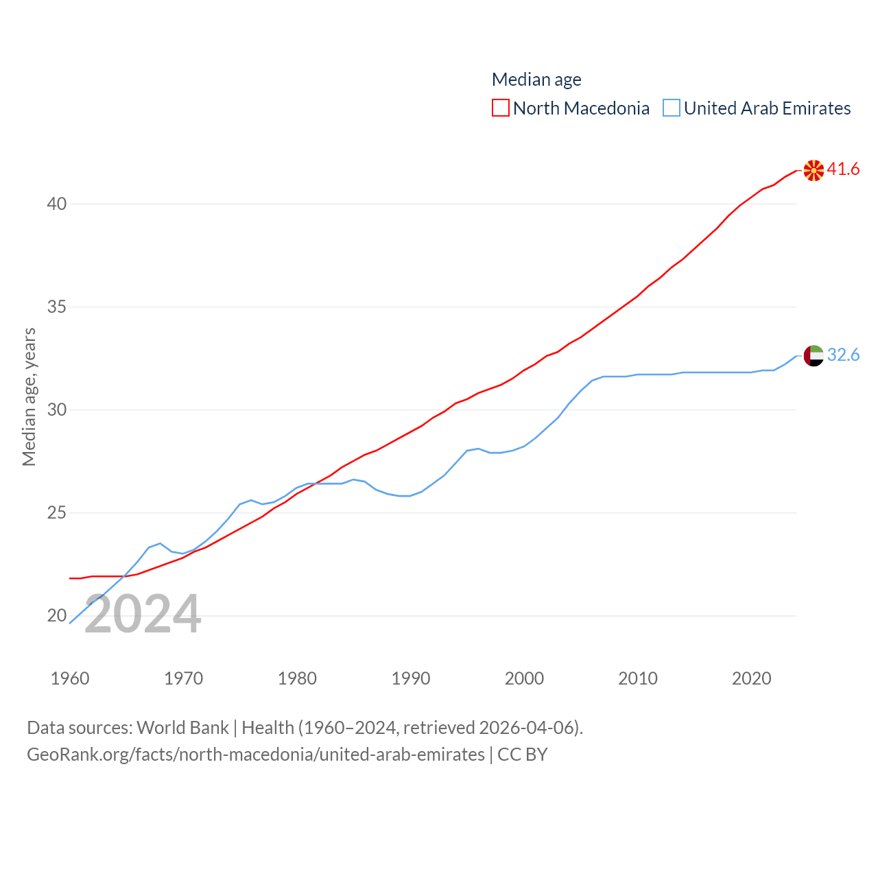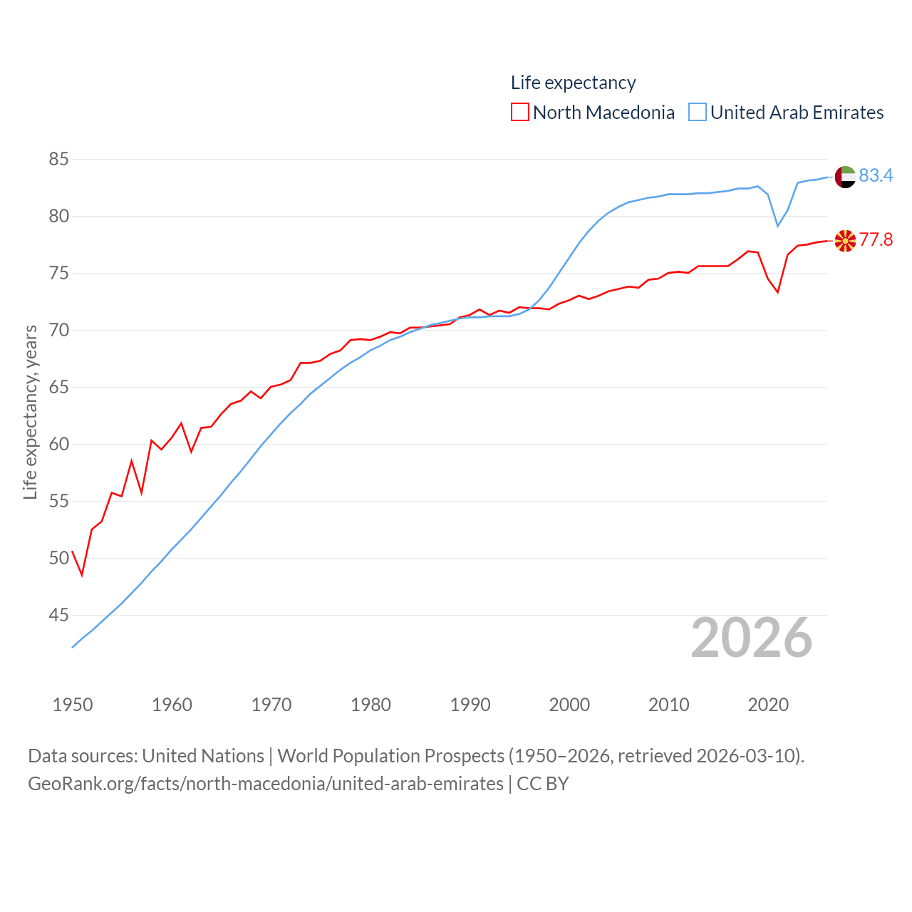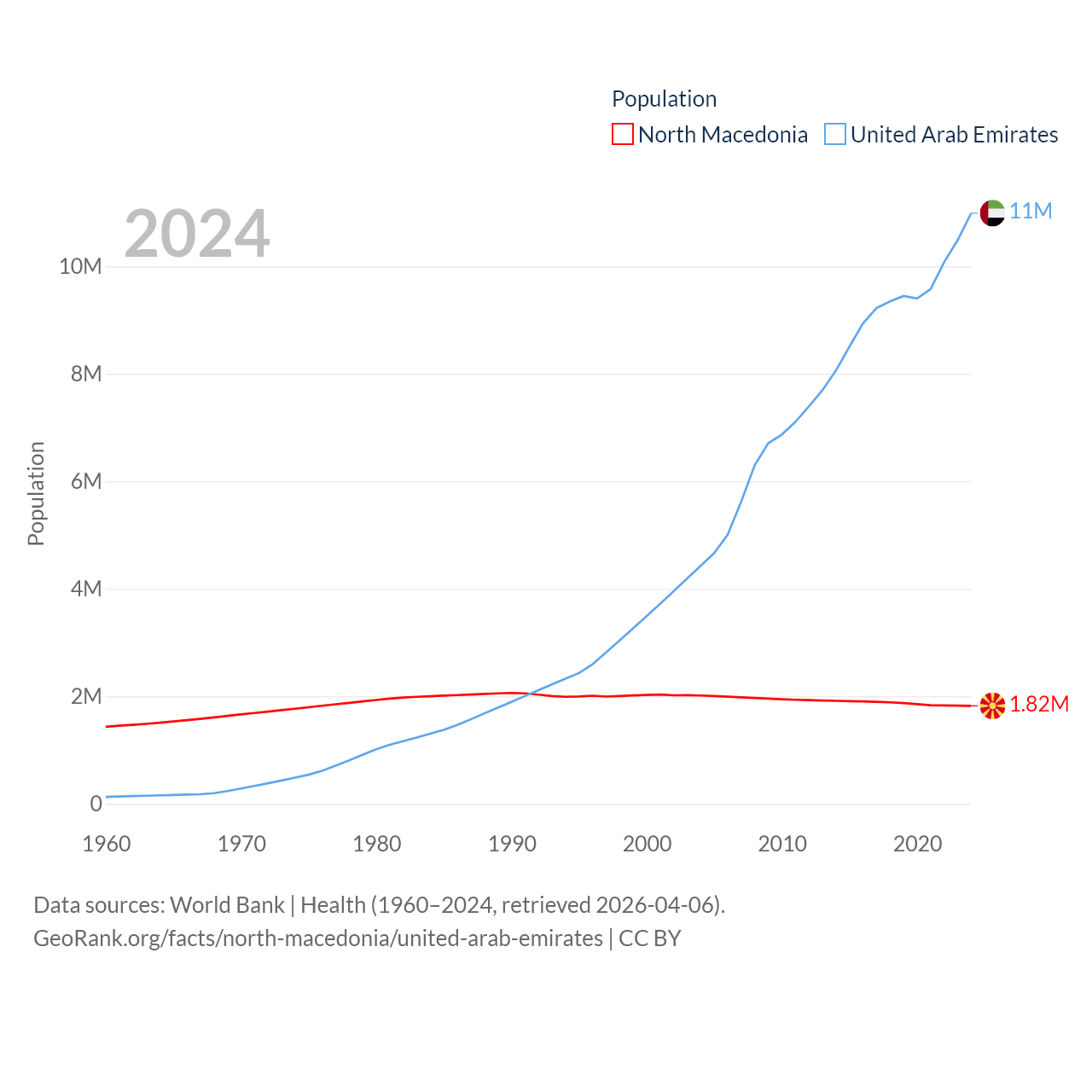 North Macedonia has a population of 1.82M (ranked 150/197), compared with 11M in The United Arab Emirates (ranked 86/197). North Macedonia's land area is 9,737 sq mi versus 27,421 sq mi for The United Arab Emirates (ranked 145th vs. 117th).