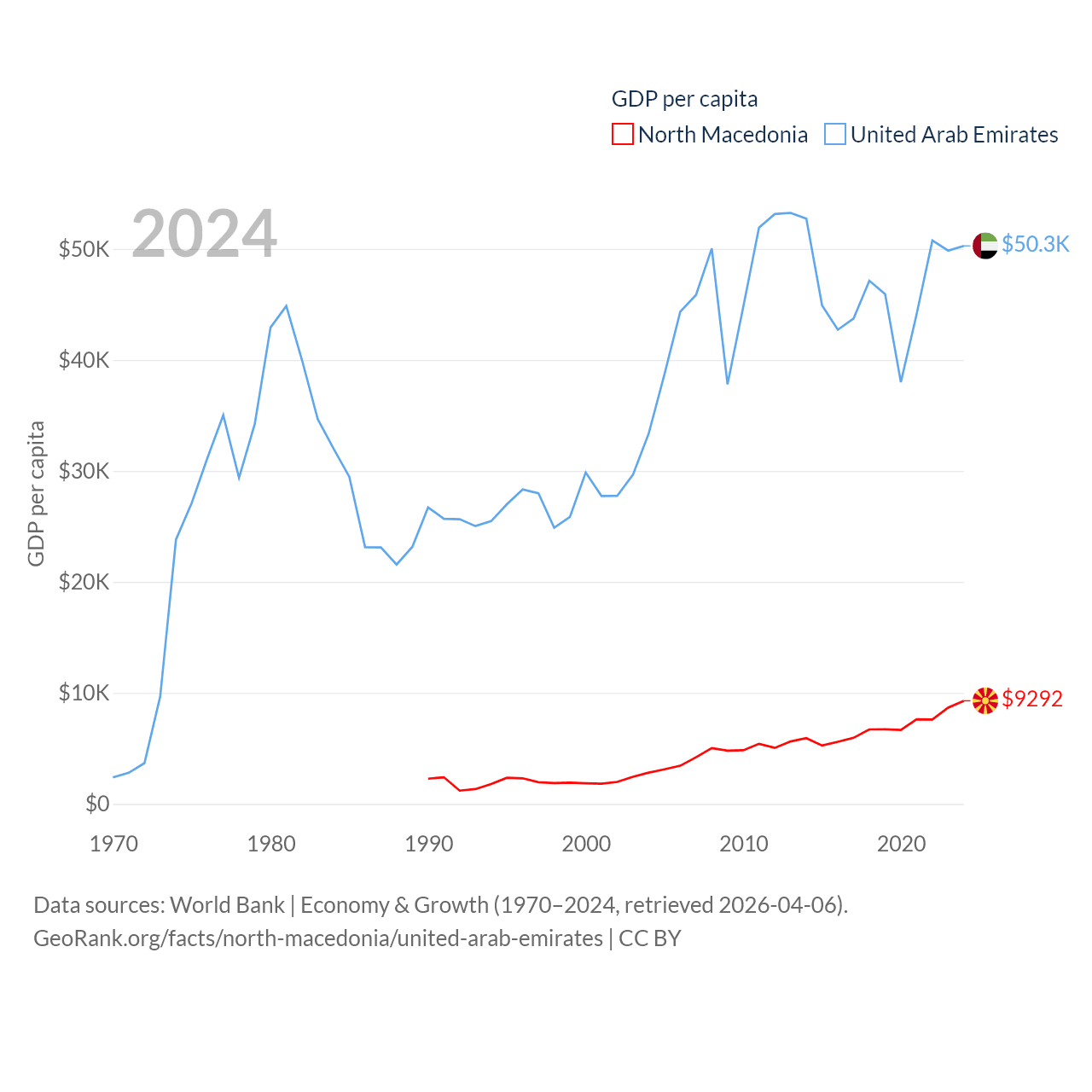 By GDP, North Macedonia ranks 138/197 ($17B) and The United Arab Emirates ranks 27/197 ($552B). By GDP per capita, North Macedonia ranks 88/197 ($9,292), while The United Arab Emirates ranks 24/197 ($50,274).