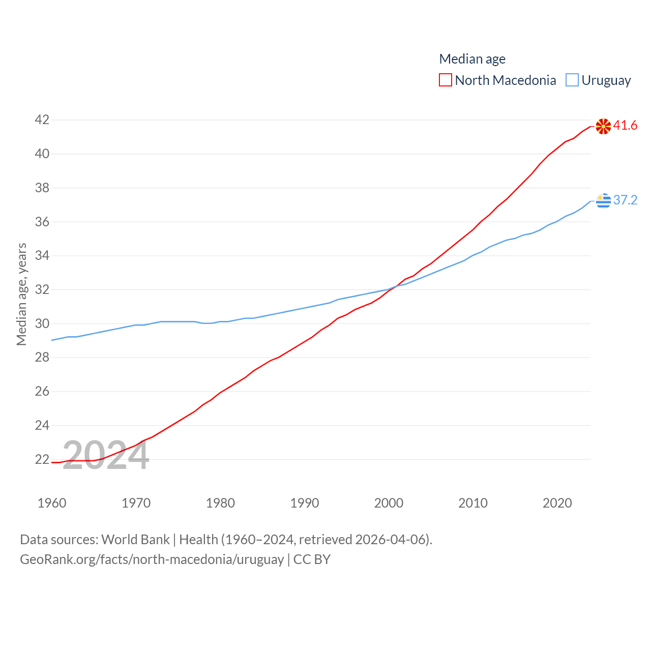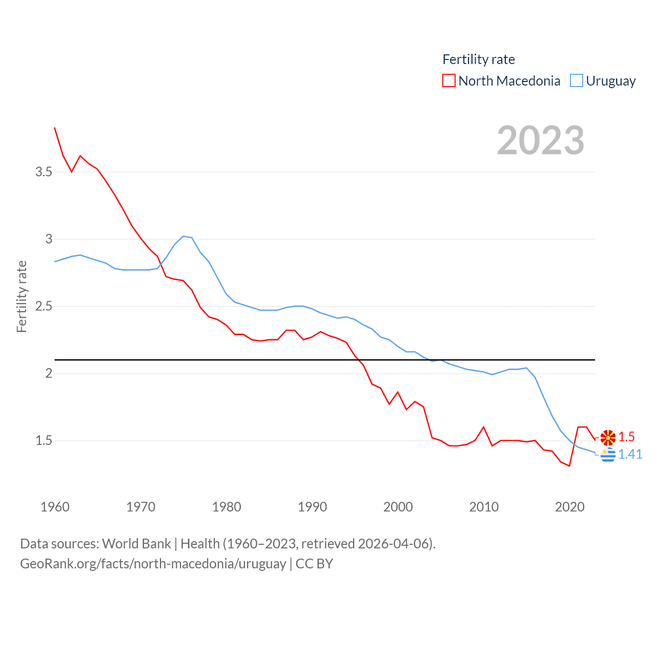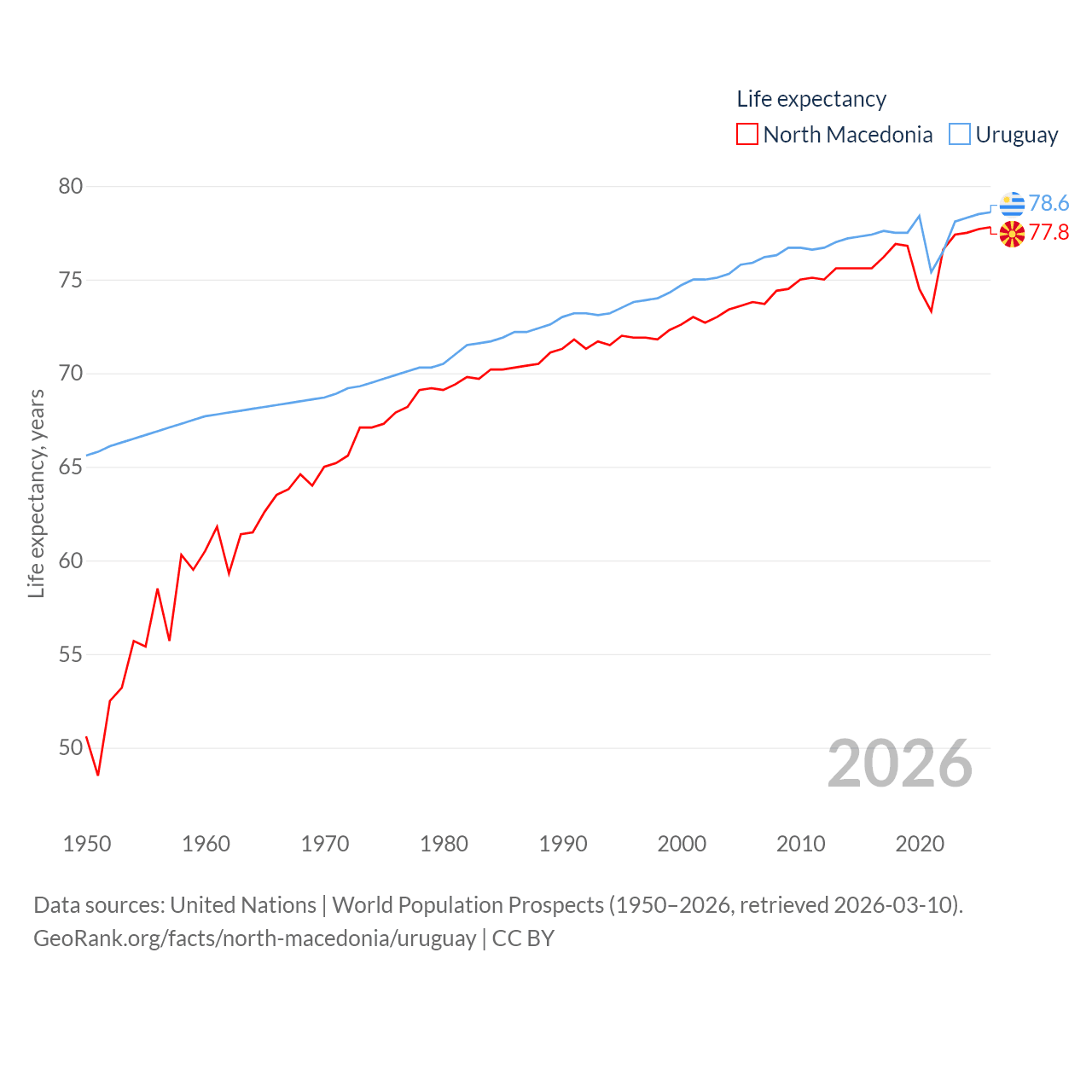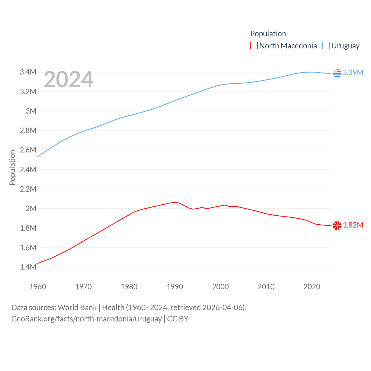 North Macedonia has a population of 1.82M (ranked 150/197), compared with 3.39M in Uruguay (ranked 133/197). North Macedonia's land area is 9,737 sq mi versus 67,576 sq mi for Uruguay (ranked 145th vs. 89th).