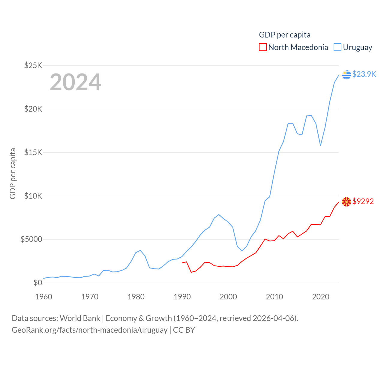 By GDP, North Macedonia ranks 138/197 ($17B) and Uruguay ranks 81/197 ($81B). By GDP per capita, North Macedonia ranks 88/197 ($9,292), while Uruguay ranks 52/197 ($23,907).