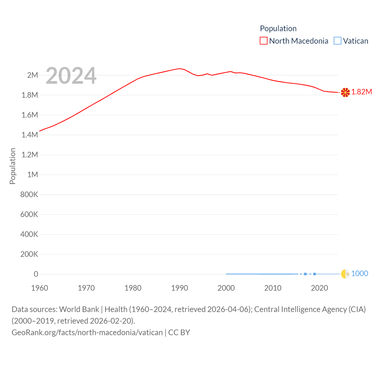 North Macedonia has a population of 1.82M (ranked 150/197), compared with 1K in The Vatican (ranked 197/197). North Macedonia's land area is 9,737 sq mi versus 0.17 sq mi for The Vatican (ranked 145th vs. 197th).