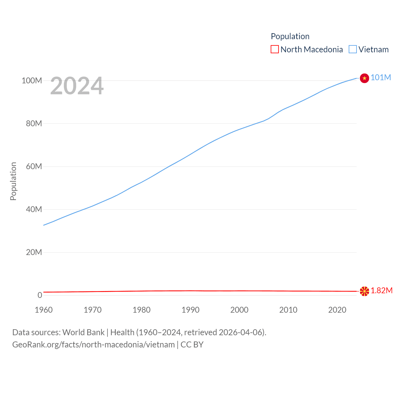 North Macedonia has a population of 1.82M (ranked 150/197), compared with 101M in Vietnam (ranked 16/197). North Macedonia's land area is 9,737 sq mi versus 121,016 sq mi for Vietnam (ranked 145th vs. 67th).