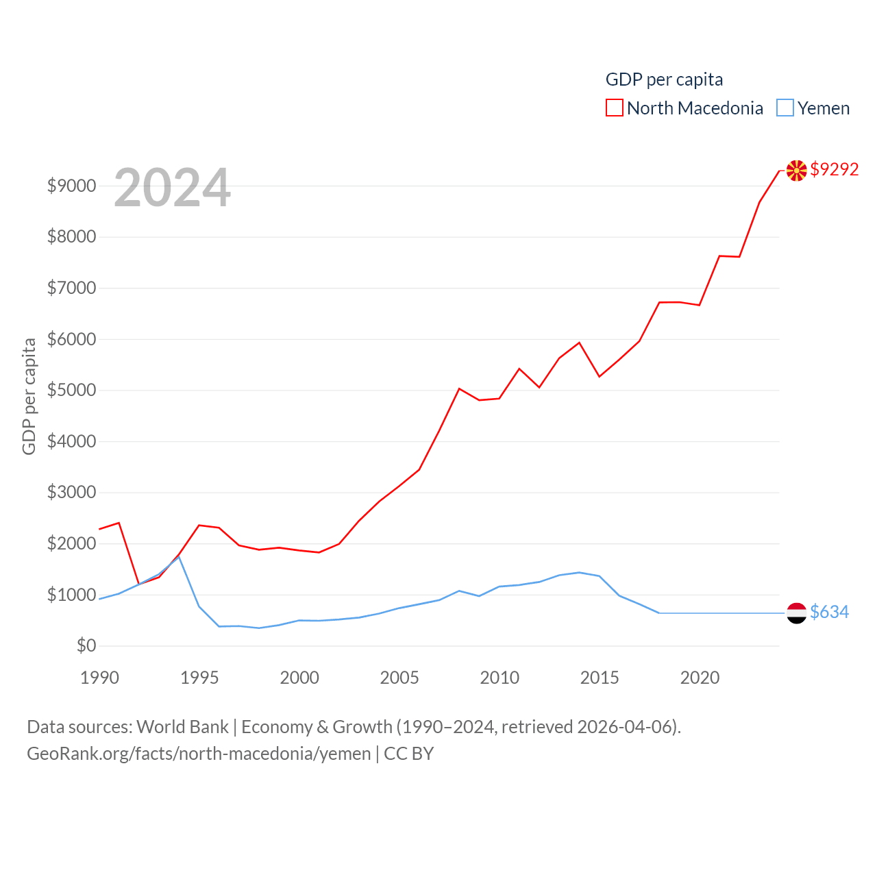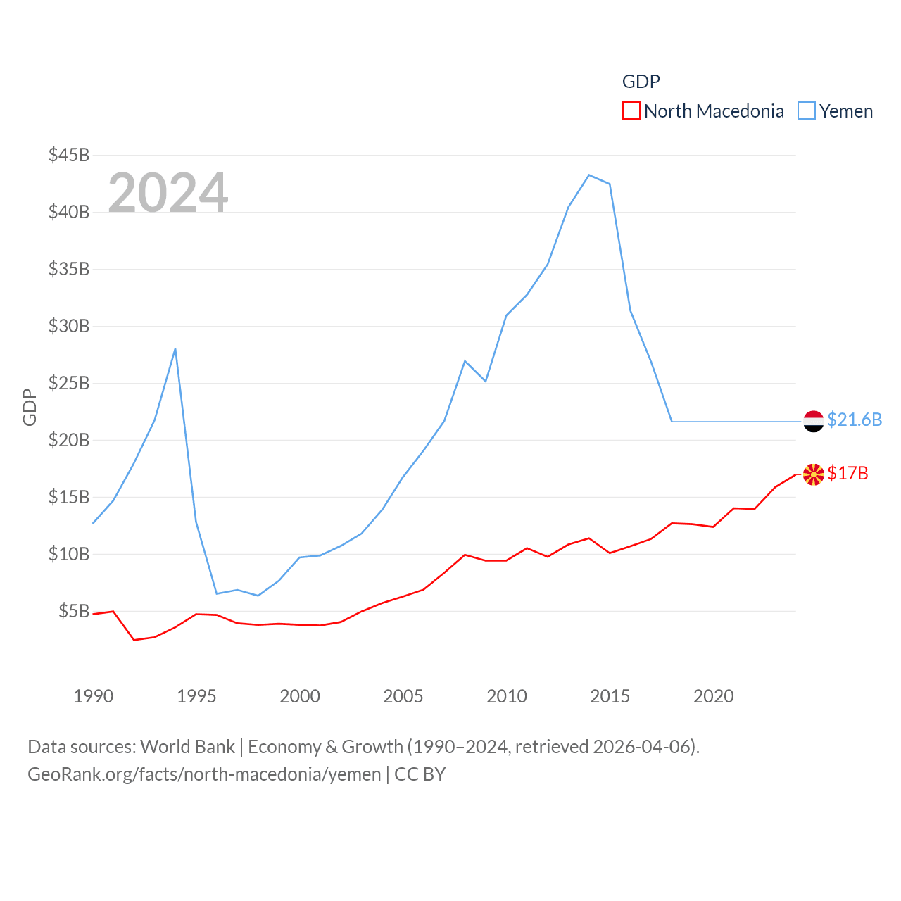 By GDP, North Macedonia ranks 138/197 ($17B) and Yemen ranks 125/197 ($21.6B). By GDP per capita, North Macedonia ranks 88/197 ($9,292), while Yemen ranks 191/197 ($634).