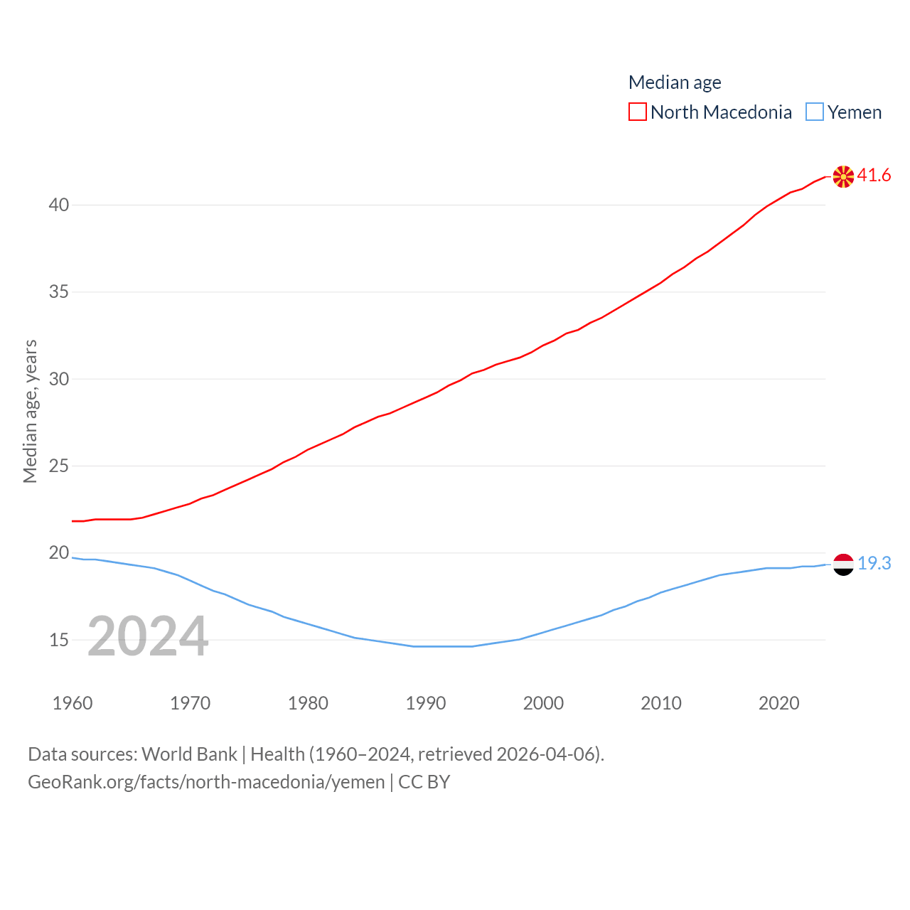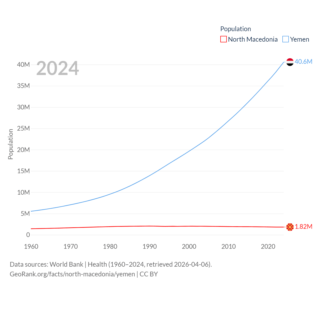 North Macedonia has a population of 1.82M (ranked 150/197), compared with 40.6M in Yemen (ranked 38/197). North Macedonia's land area is 9,737 sq mi versus 203,850 sq mi for Yemen (ranked 145th vs. 49th).