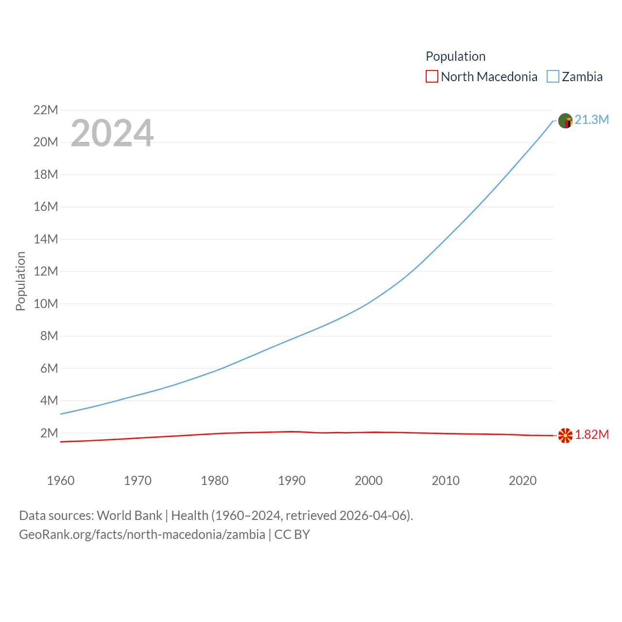 North Macedonia has a population of 1.82M (ranked 150/197), compared with 21.3M in Zambia (ranked 63/197). North Macedonia's land area is 9,737 sq mi versus 287,024 sq mi for Zambia (ranked 145th vs. 37th).