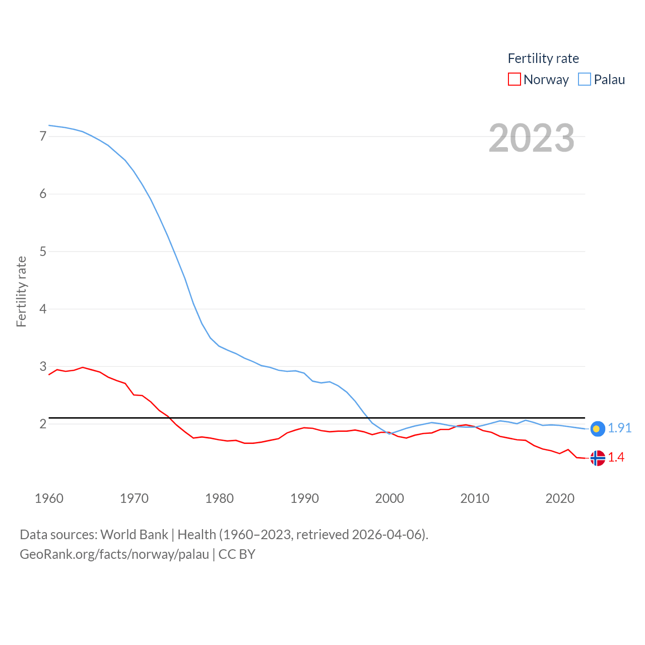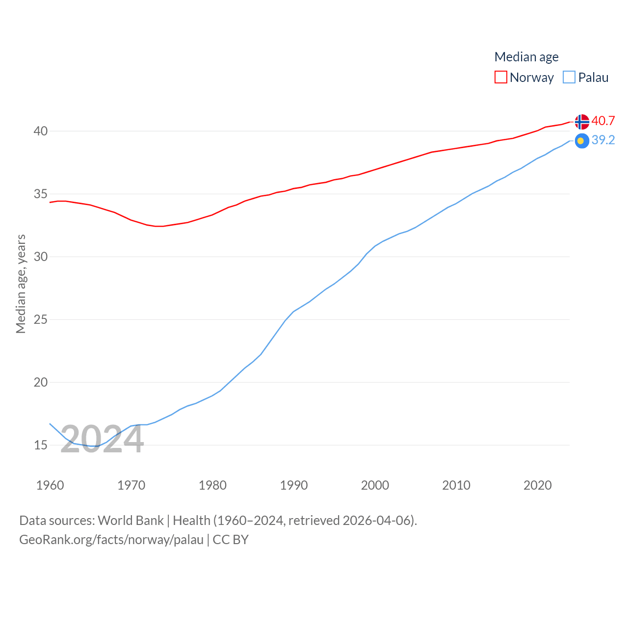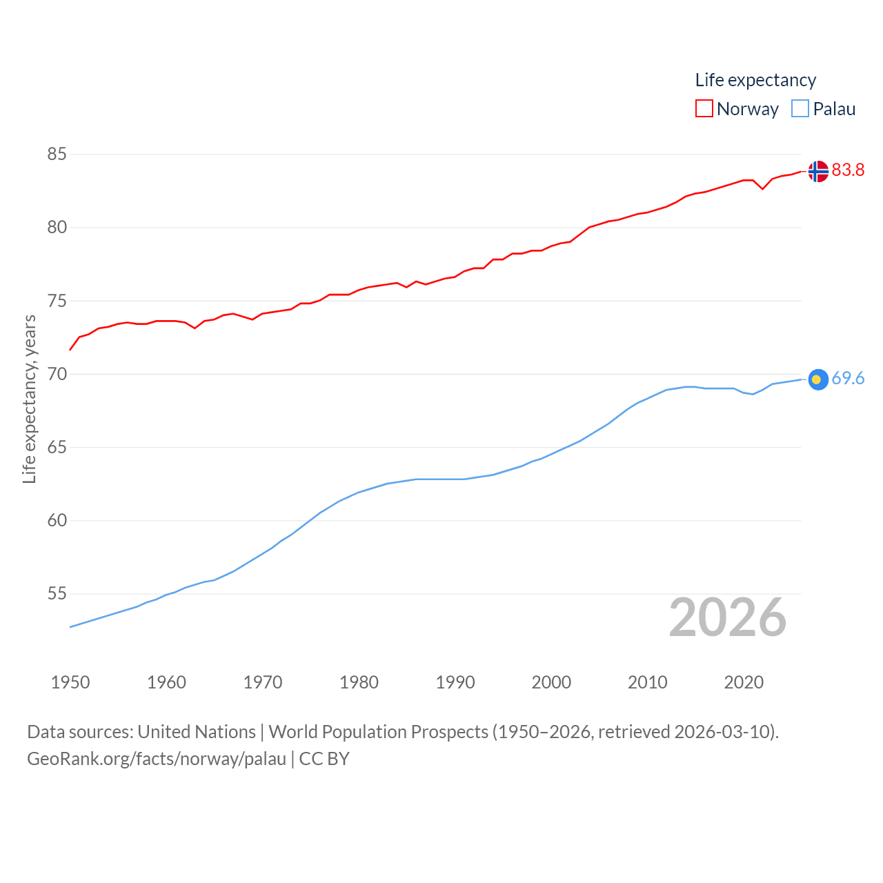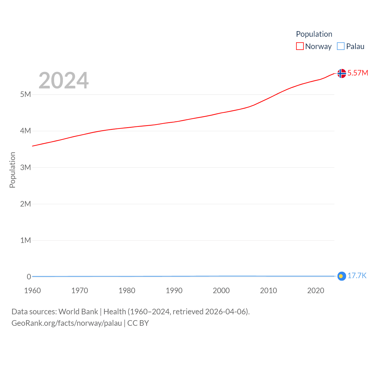 Norway has a population of 5.57M (ranked 118/197), compared with 17.7K in Palau (ranked 194/197). Norway's land area is 140,645 sq mi versus 177.6 sq mi for Palau (ranked 62nd vs. 180th).