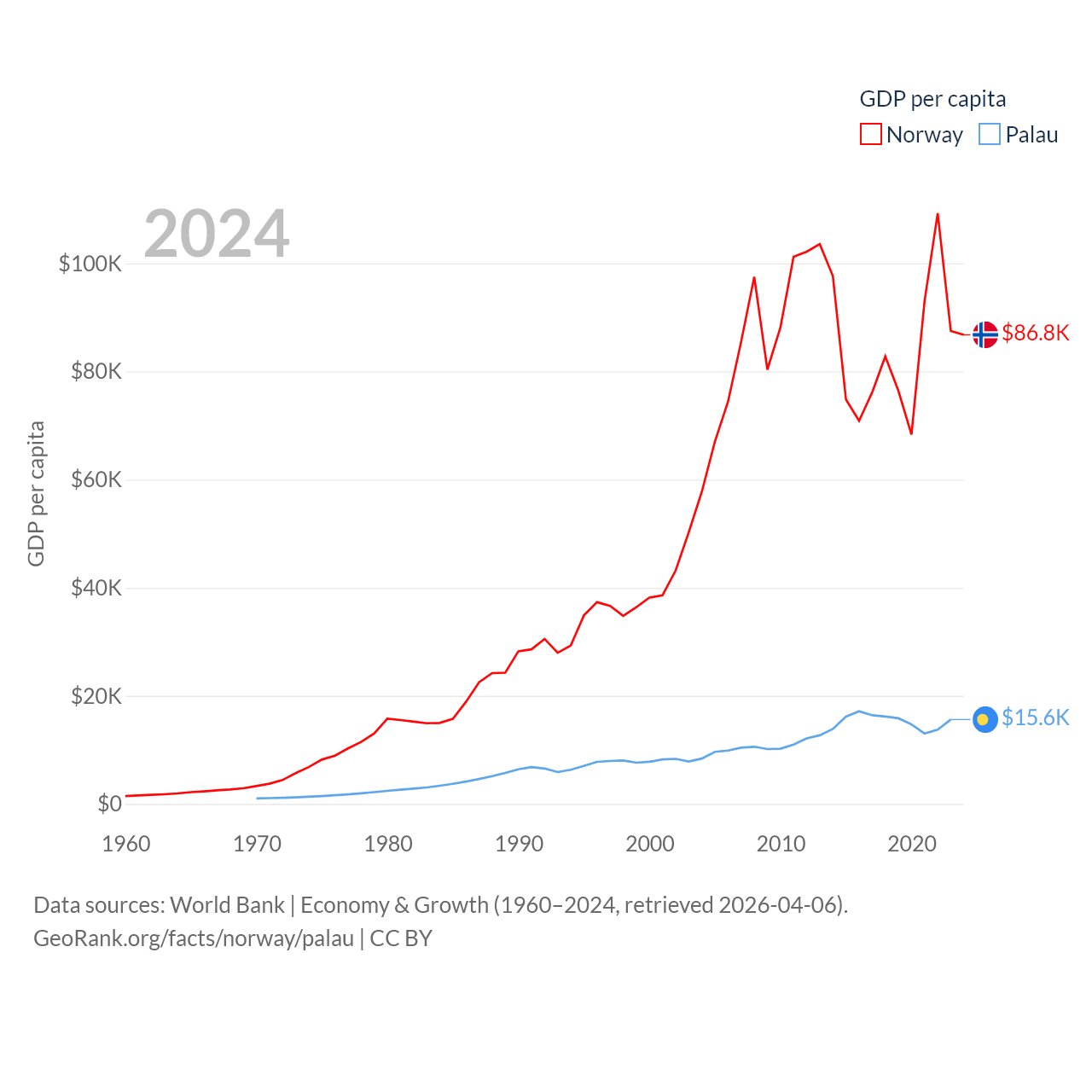By GDP, Norway ranks 32/197 ($484B) and Palau ranks 194/197 ($277M). By GDP per capita, Norway ranks 8/197 ($86,785), while Palau ranks 67/197 ($15,611).