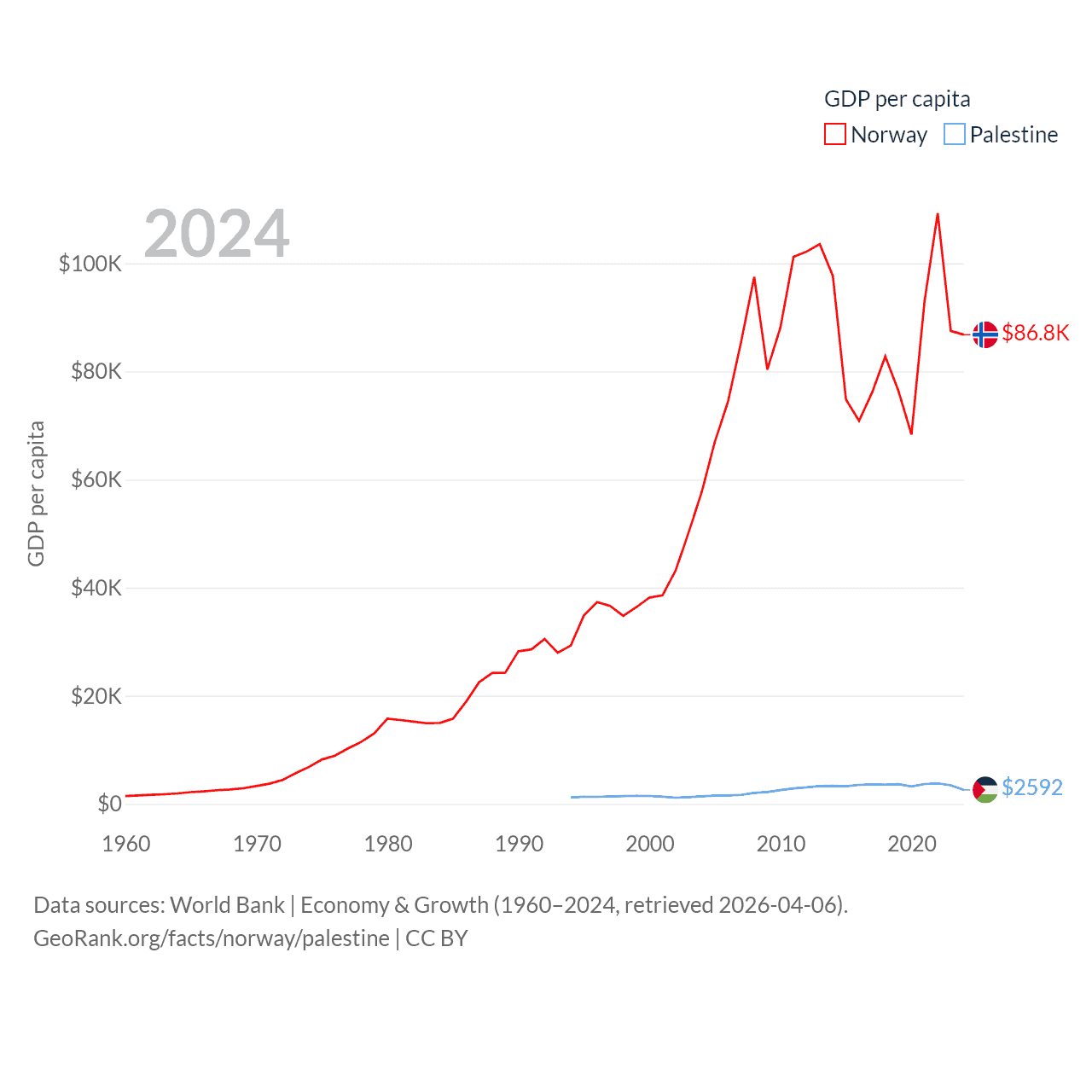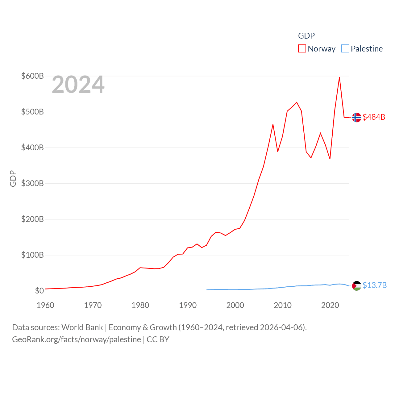 By GDP, Norway ranks 32/197 ($484B) and Palestine ranks 146/197 ($13.7B). By GDP per capita, Norway ranks 8/197 ($86,785), while Palestine ranks 147/197 ($2,592).
