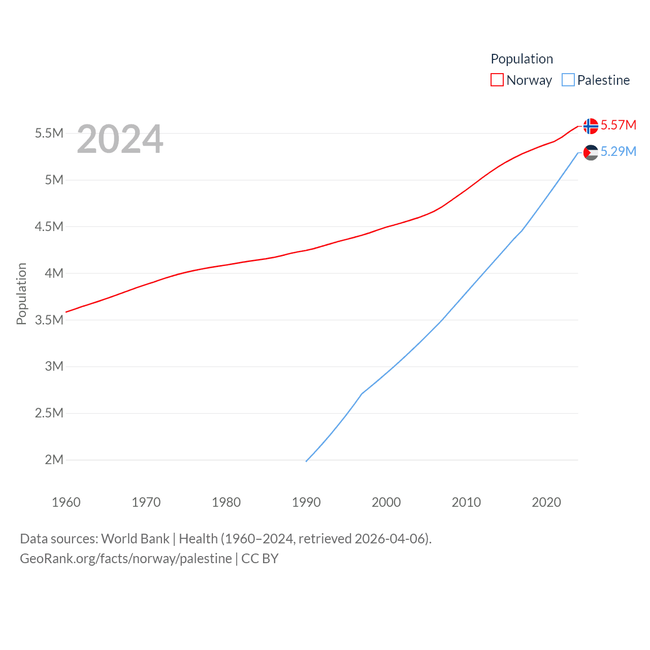 Norway has a population of 5.57M (ranked 118/197), compared with 5.29M in Palestine (ranked 122/197). Norway's land area is 140,645 sq mi versus 2,326 sq mi for Palestine (ranked 62nd vs. 164th).