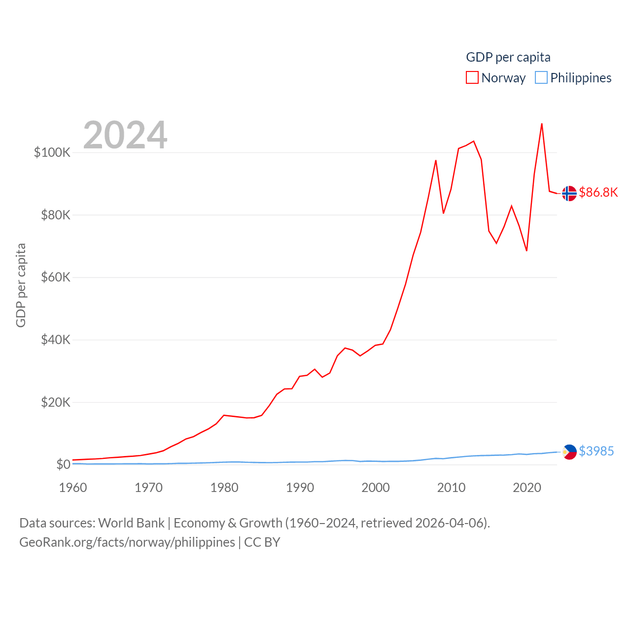 By GDP, Norway ranks 32/197 ($484B) and The Philippines ranks 35/197 ($462B). By GDP per capita, Norway ranks 8/197 ($86,785), while The Philippines ranks 130/197 ($3,985).
