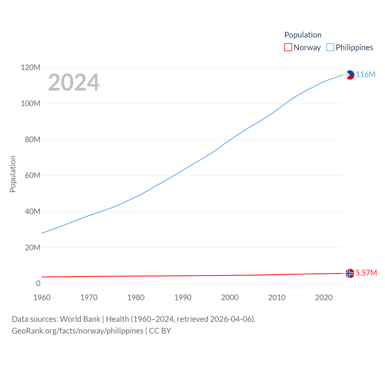 Norway has a population of 5.57M (ranked 118/197), compared with 116M in The Philippines (ranked 14/197). Norway's land area is 140,645 sq mi versus 115,124 sq mi for The Philippines (ranked 62nd vs. 71st).