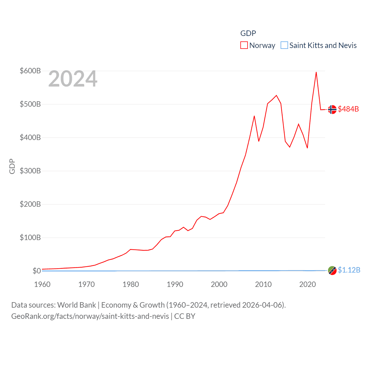 By GDP, Norway ranks 32/197 ($484B) and Saint Kitts and Nevis ranks 187/197 ($1.12B). By GDP per capita, Norway ranks 8/197 ($86,785), while Saint Kitts and Nevis ranks 51/197 ($23,961).