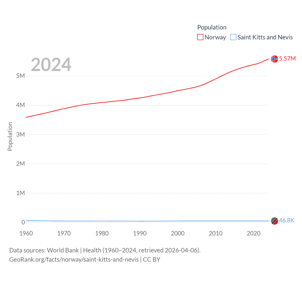 Norway has a population of 5.57M (ranked 118/197), compared with 46.8K in Saint Kitts and Nevis (ranked 189/197). Norway's land area is 140,645 sq mi versus 100.4 sq mi for Saint Kitts and Nevis (ranked 62nd vs. 189th).