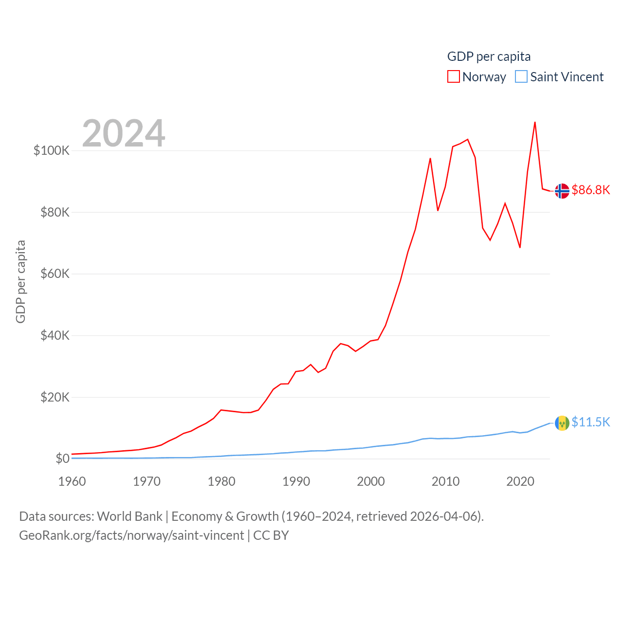 By GDP, Norway ranks 32/197 ($484B) and Saint Vincent ranks 186/197 ($1.16B). By GDP per capita, Norway ranks 8/197 ($86,785), while Saint Vincent ranks 81/197 ($11,501).