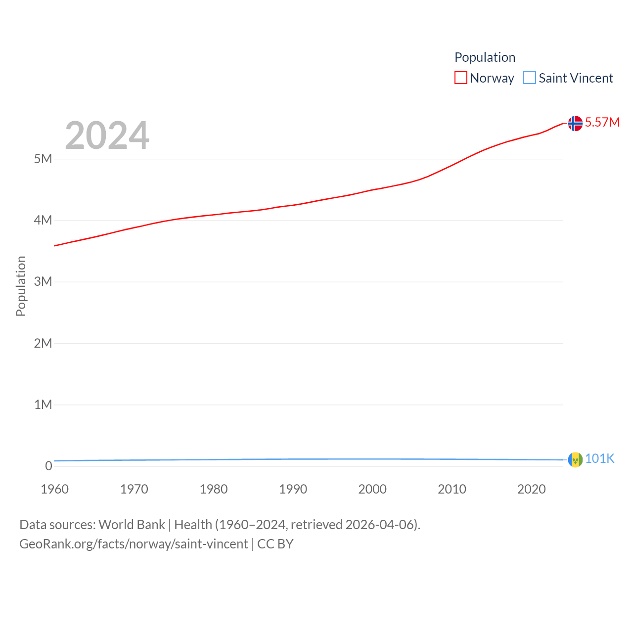 Norway has a population of 5.57M (ranked 118/197), compared with 101K in Saint Vincent (ranked 184/197). Norway's land area is 140,645 sq mi versus 150.6 sq mi for Saint Vincent (ranked 62nd vs. 185th).