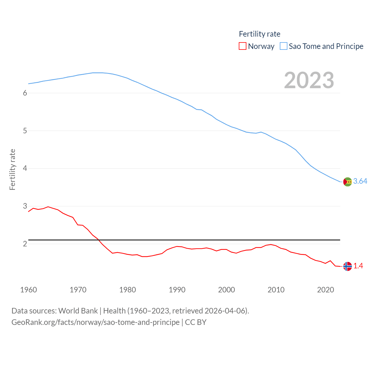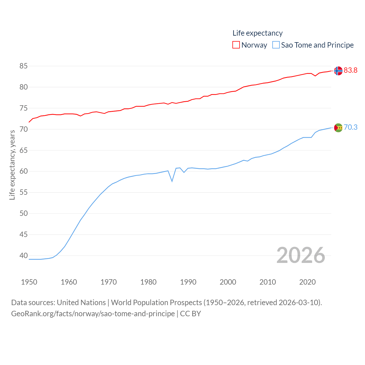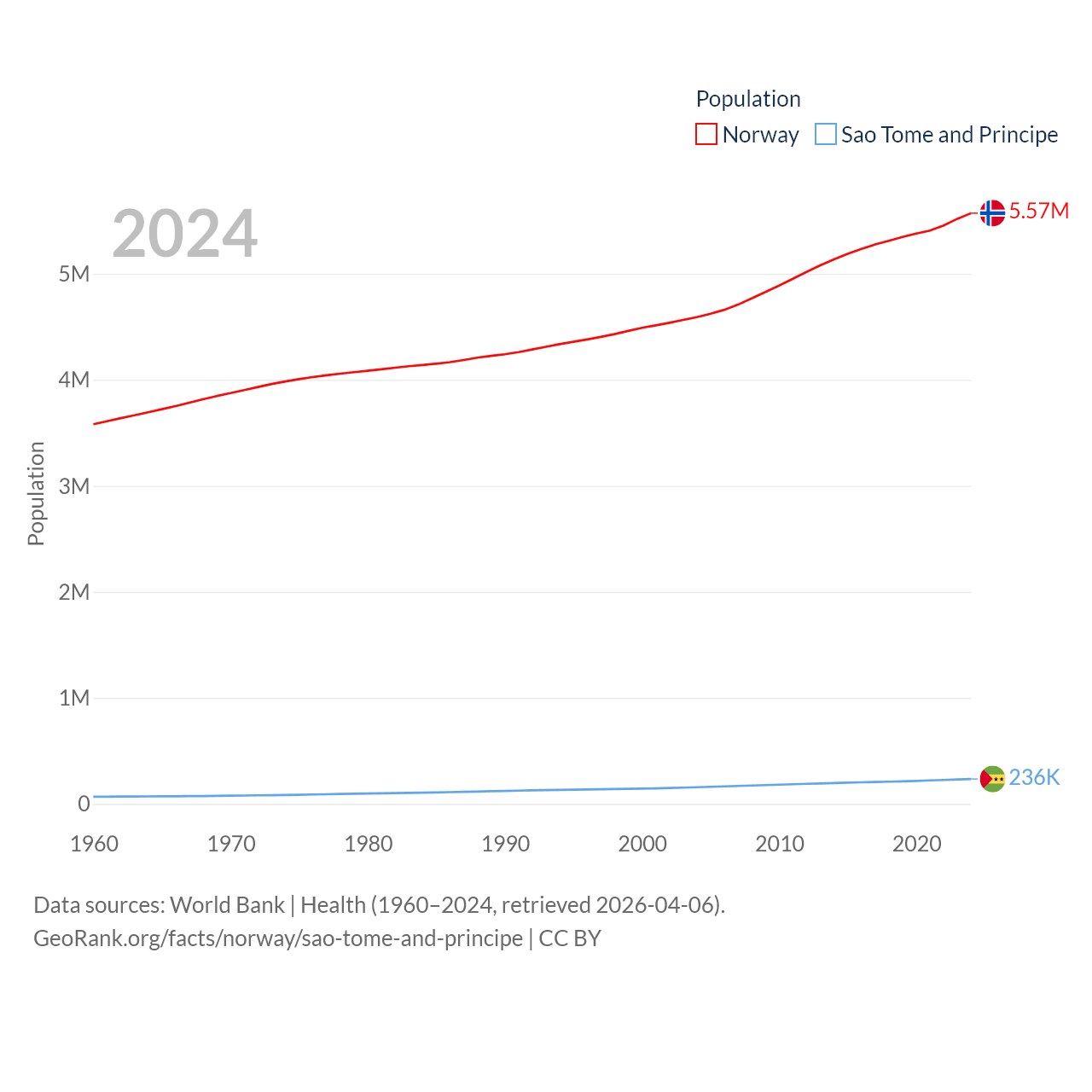 Norway has a population of 5.57M (ranked 118/197), compared with 236K in Sao Tome and Principe (ranked 176/197). Norway's land area is 140,645 sq mi versus 371 sq mi for Sao Tome and Principe (ranked 62nd vs. 172nd).